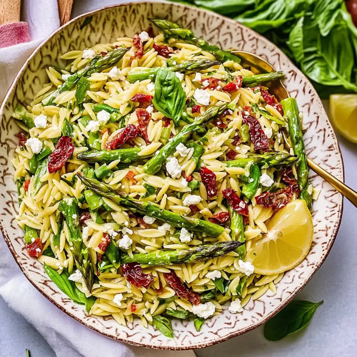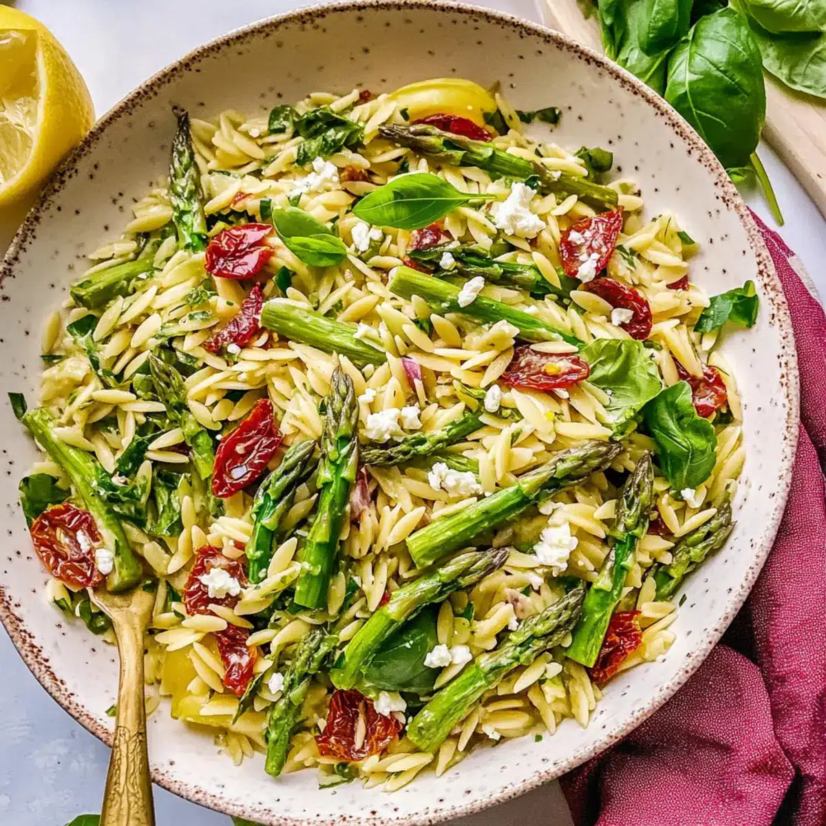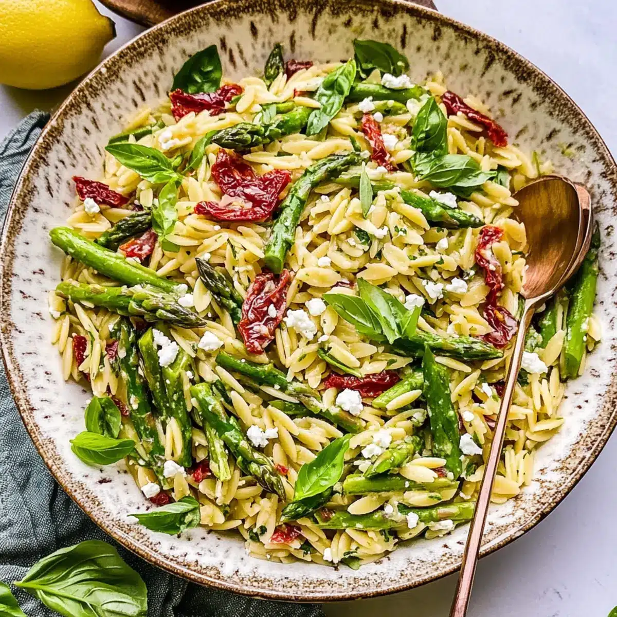- Toss Salad: In a bowl, combine cooled orzo, sautéed asparagus, sun-dried tomatoes, red onion, basil, and feta. Fold in vinaigrette, adjusting seasoning as necessary.