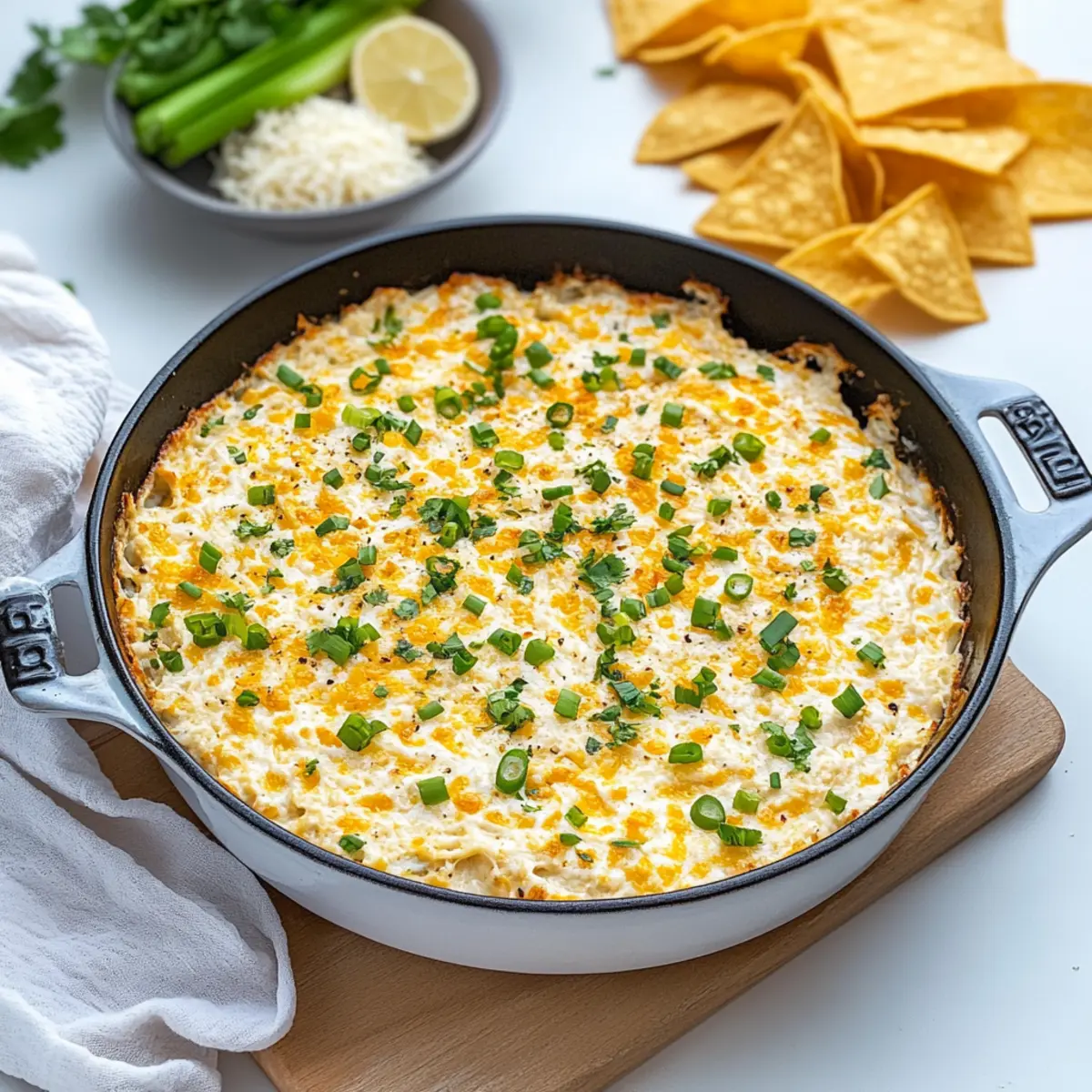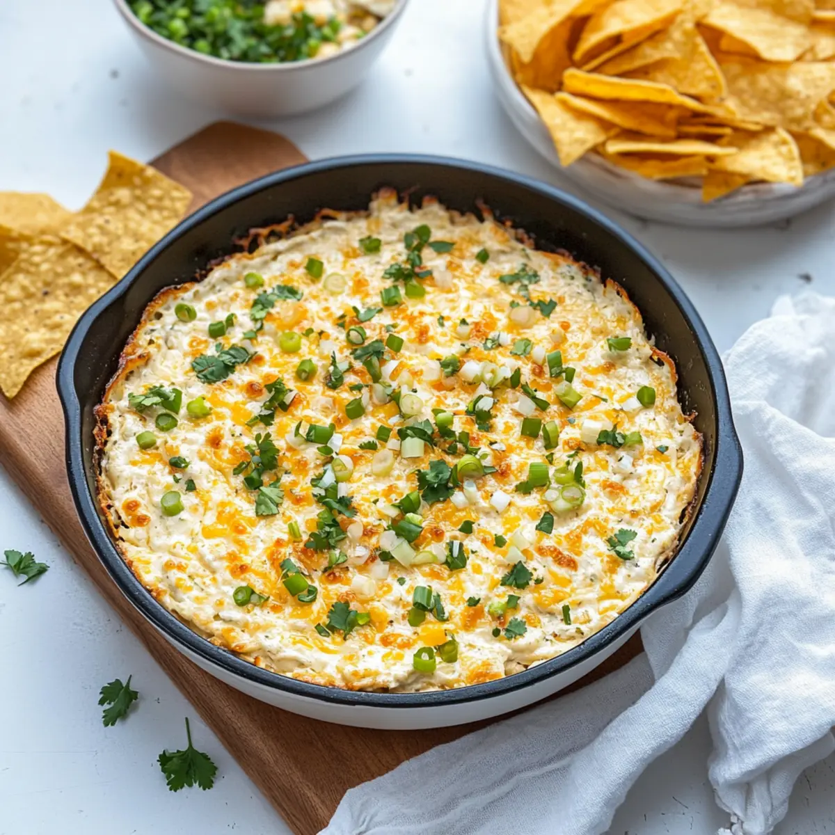 - Let the dip cool slightly. Top with reserved scallions and cilantro. Serve immediately with tortilla chips or fresh veggies.