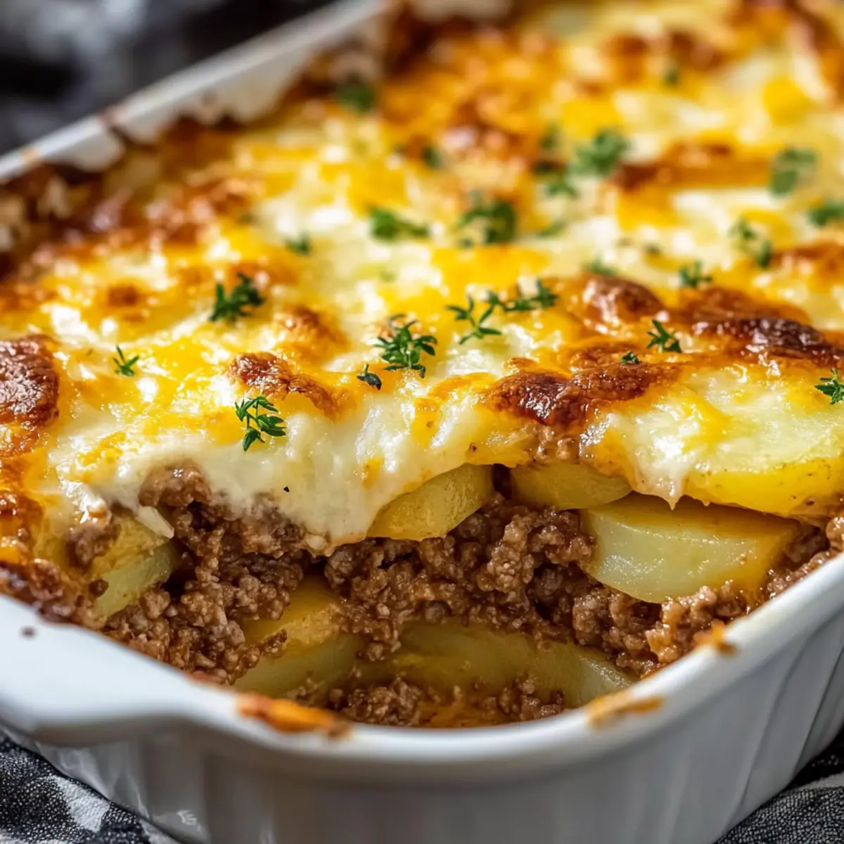 - Layer half of the sliced potatoes in the baking dish, followed by half of the beef mixture and half of the cheddar cheese. Repeat the layers.