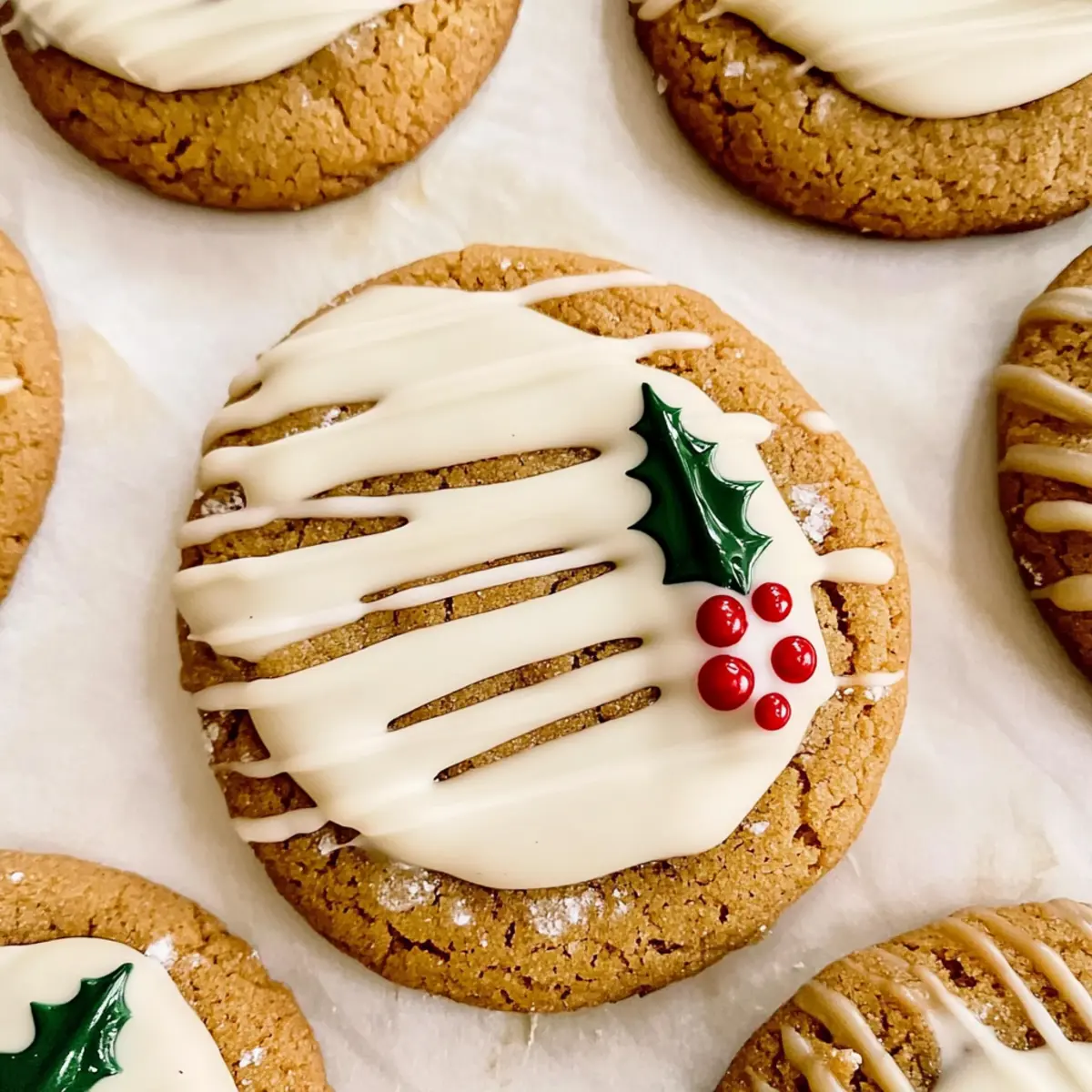 Once the cookies are fully cooled, dip half of each cookie into the melted white chocolate and place them back on the parchment paper. Drizzle any remaining melted chocolate over the tops, and for a festive touch, sprinkle the cookies with holly berry sprinkles while the chocolate is still warm.