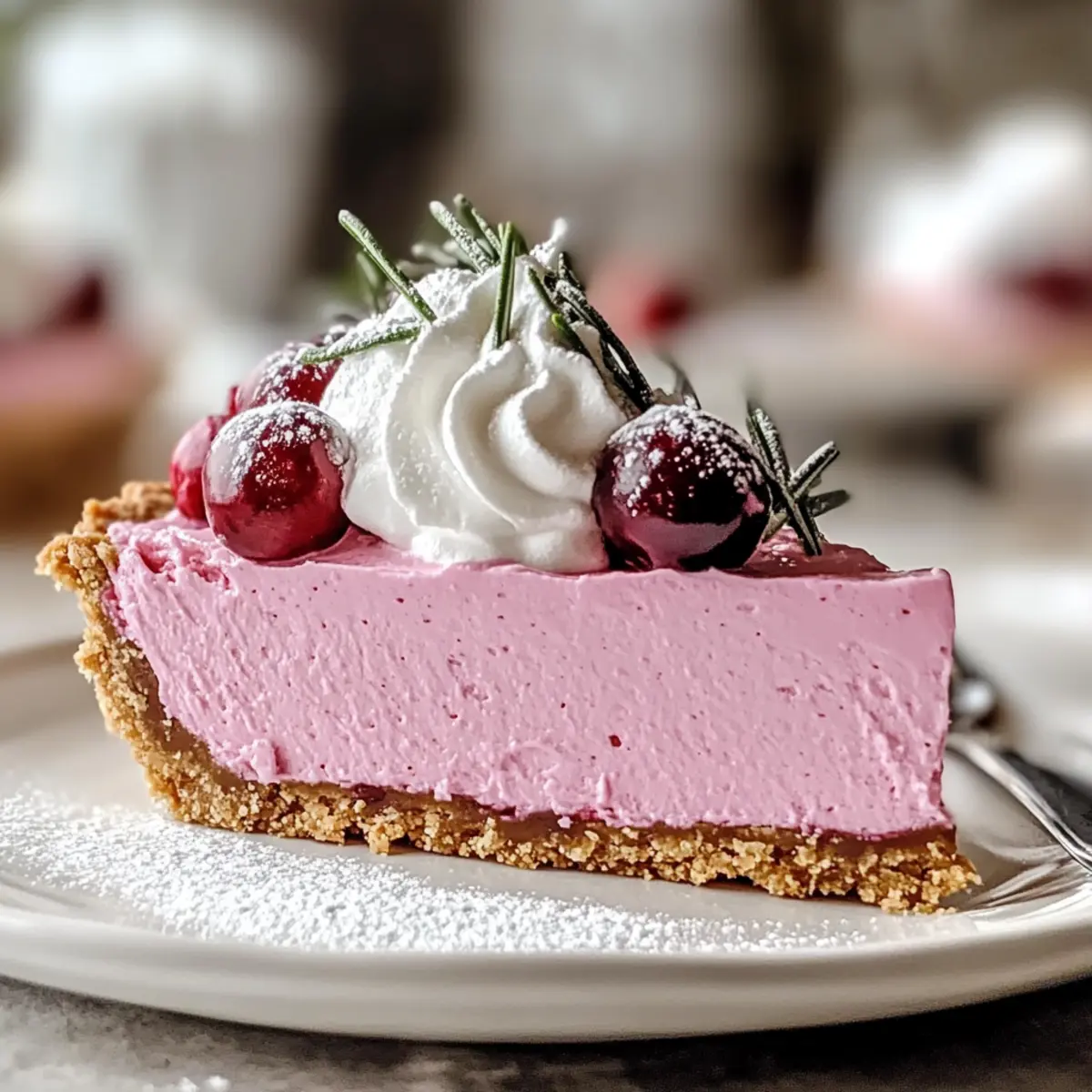 Just before serving, top the chilled pie with additional whipped cream, and if desired, sprinkle with cranberries dusted with powdered sugar. You can also add festive fresh rosemary as a garnish, enhancing the presentation and offering a pop of color to your already stunning Cranberry Mousse Pie.