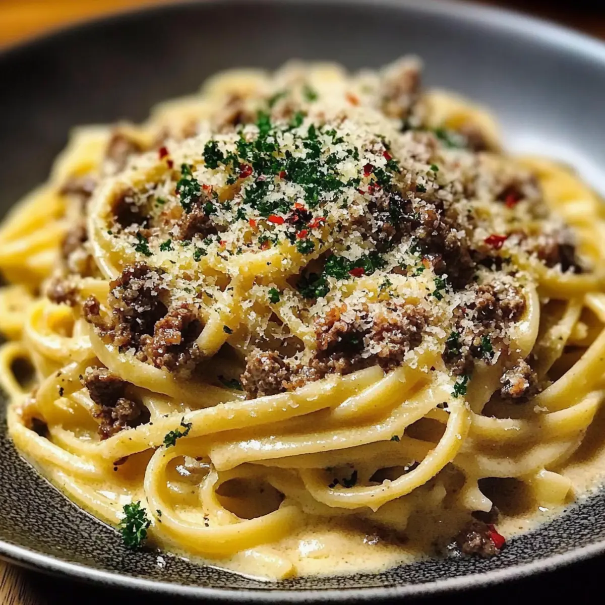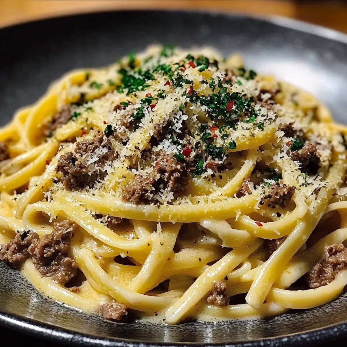 Remove the skillet from heat and taste the dish, adjusting seasoning as necessary. For a fresh touch, garnish your creamy parmesan beef linguine with a sprinkle of finely chopped fresh parsley or thyme and an optional pinch of red pepper flakes for warmth. Serve immediately while hot, topped with extra parmesan and freshly cracked black pepper if desired.
