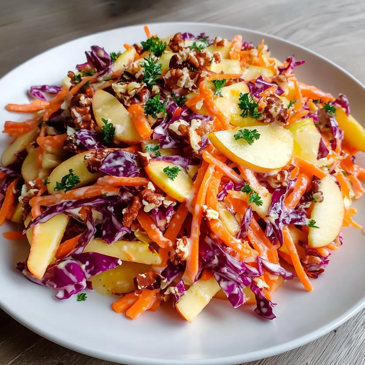 Preparing the Crunchy Apple Carrot Salad ahead of time is a game changer for busy cooks! You can grate the carrots and finely shred the red cabbage up to 24 hours in advance; simply refrigerate them in an airtight container to keep them fresh and crisp. Additionally, you can prepare the creamy citrus dressing 3 days ahead, just be sure to store it separately to maintain its creamy texture. When it’s time to serve, toss the prepped ingredients with the dressing and add the diced apples and nuts just before serving to ensure optimal crunch and flavor. This way, you’ll have a vibrant, refreshing salad ready to impress with minimal effort!