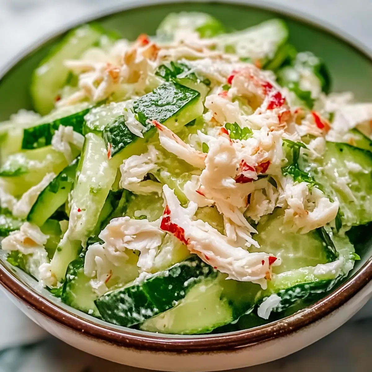 - In a large mixing bowl, toss together the cucumber strips and shredded crab meat. Pour the creamy dressing over and gently mix until evenly coated.