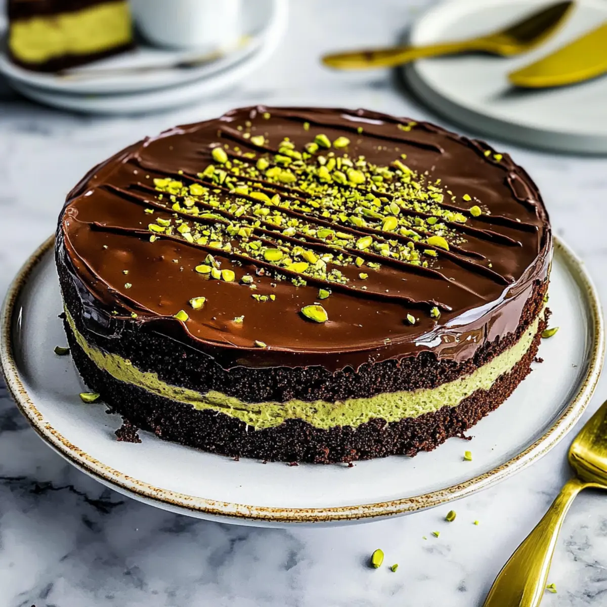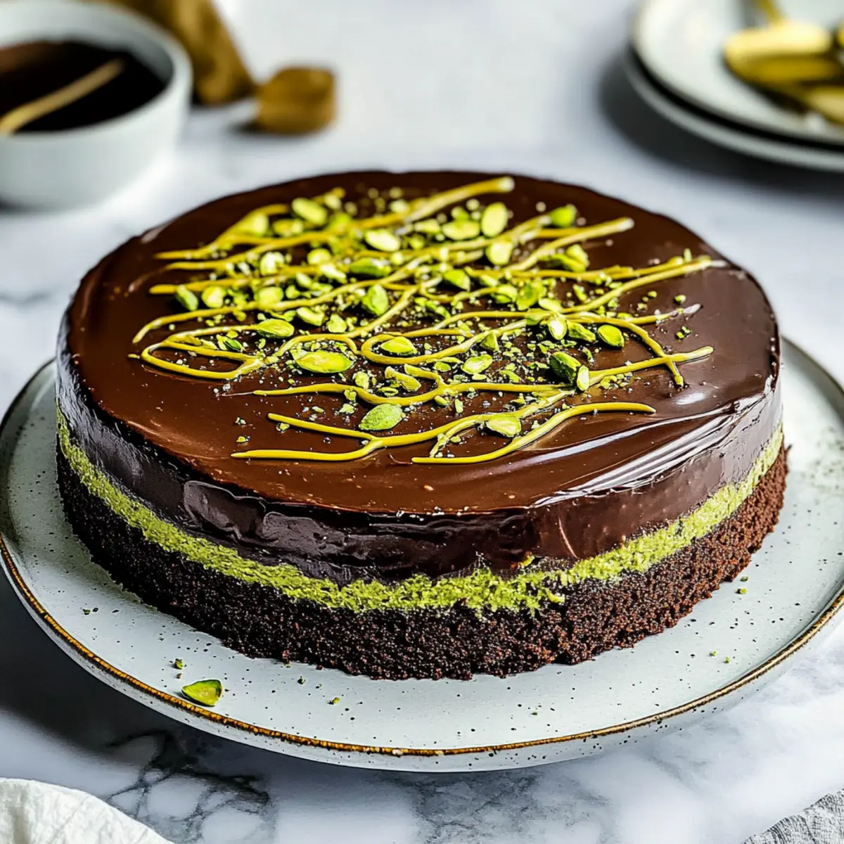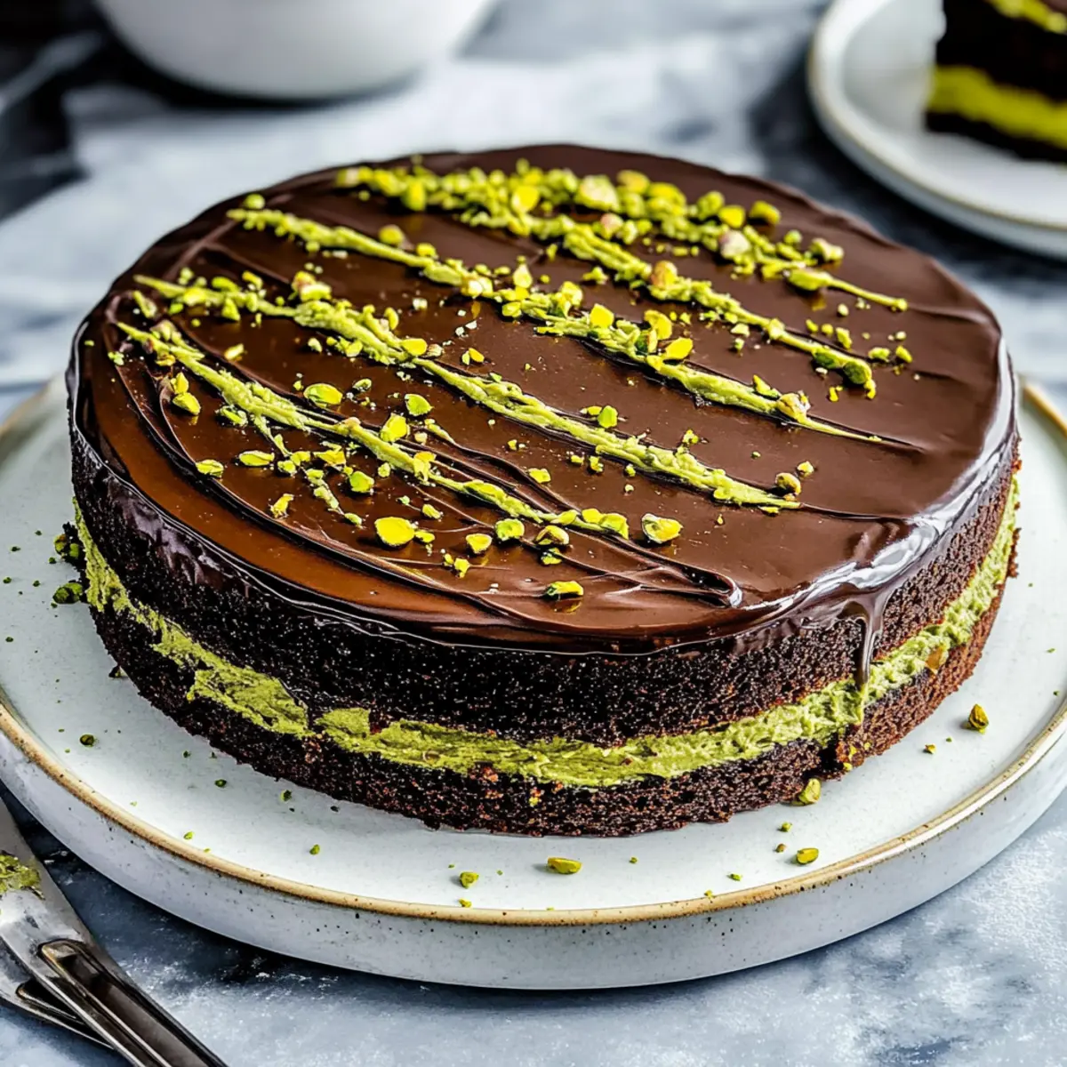 - Spread the pistachio filling on the cake, drizzle with chocolate sauce, and garnish as desired.