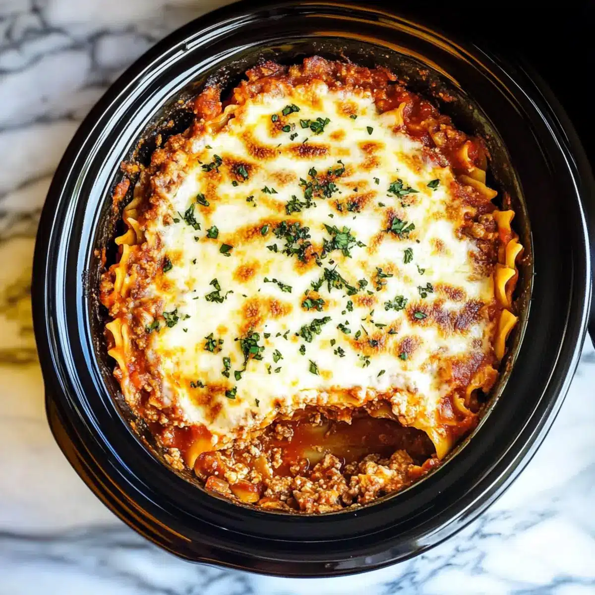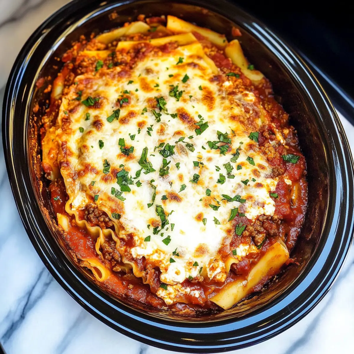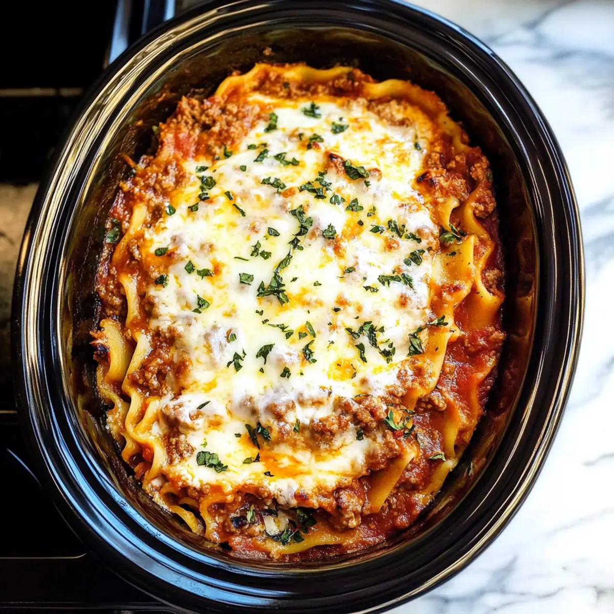 Cover the slow cooker and set it to cook on high for 3 hours or low for 6 hours. Check for doneness by ensuring the noodles are tender and the cheese is melted and bubbly. The layers should meld beautifully, creating a comforting, hearty dish. Once done, garnish with fresh basil or parsley before serving, inviting warmth and flavor to the table.
