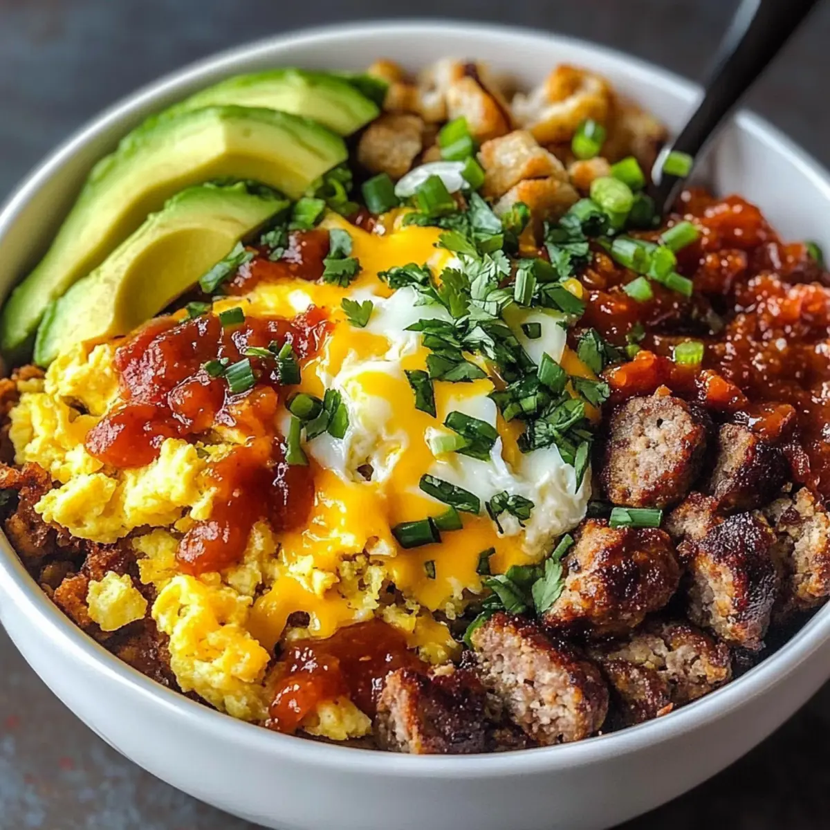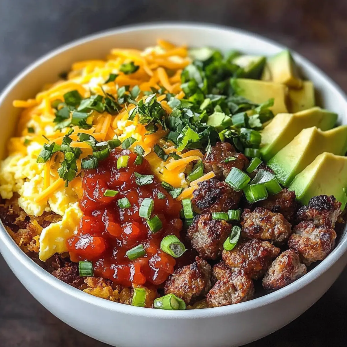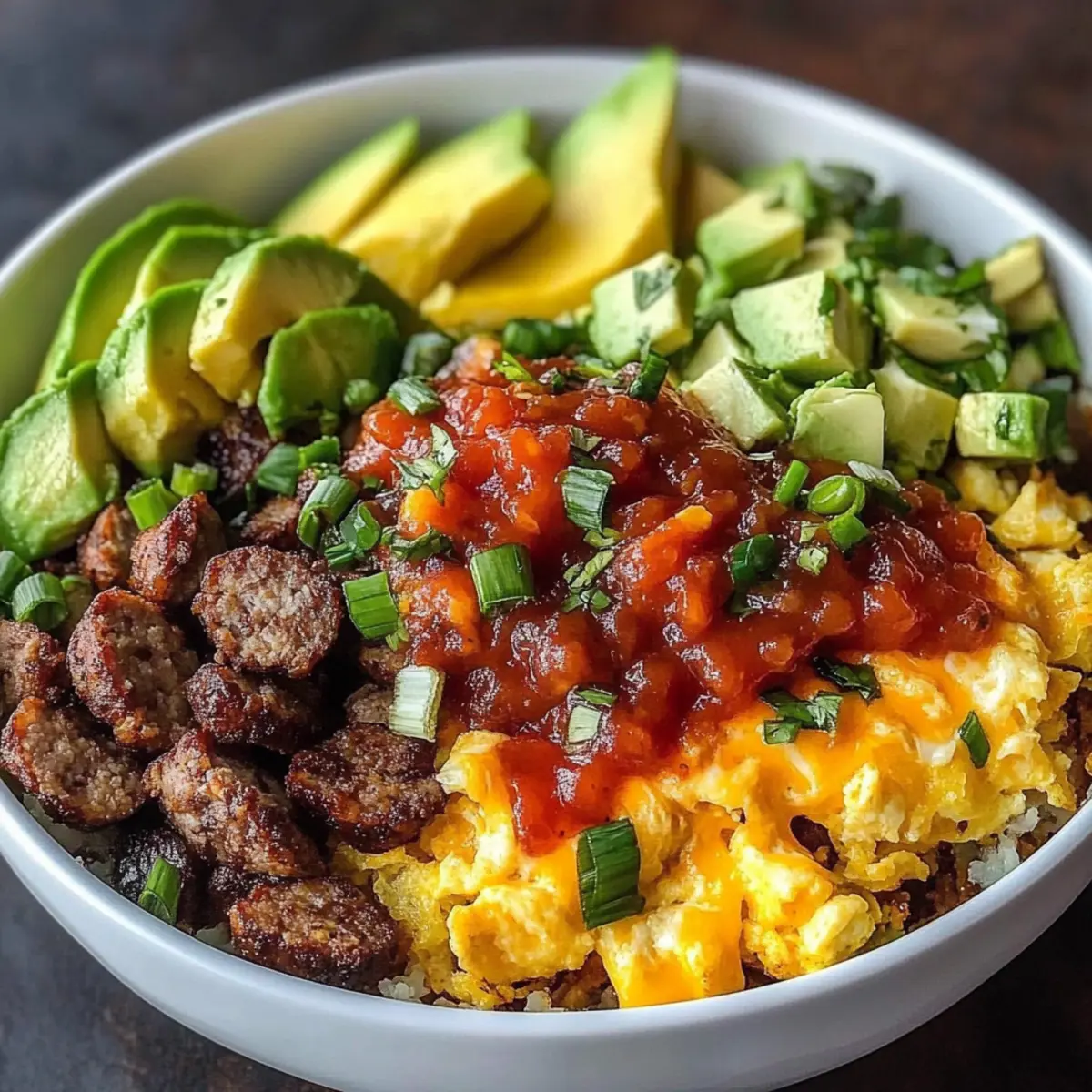Divide the crispy hash browns evenly among serving bowls. Layer the fluffy scrambled eggs on top of the hash browns, followed by the cooked sausage. Generously sprinkle with shredded cheddar cheese, allowing it to melt slightly from the heat, and top each bowl with fresh salsa and chopped avocado for a burst of flavor.