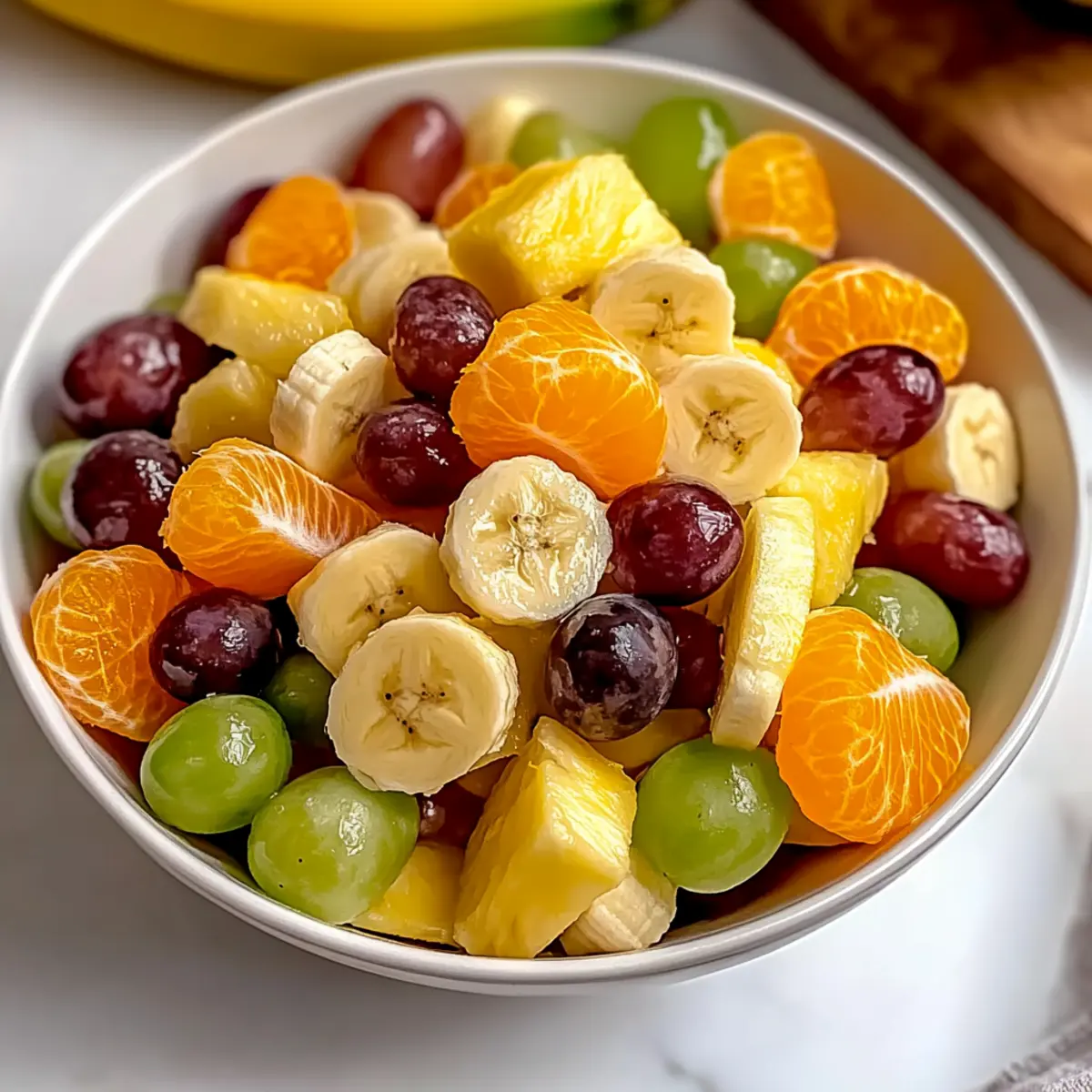 - Begin by draining the canned pineapple and reserving the juice. In a large mixing bowl, combine the pineapple, sliced bananas, halved grapes, segmented oranges, and chopped apples.