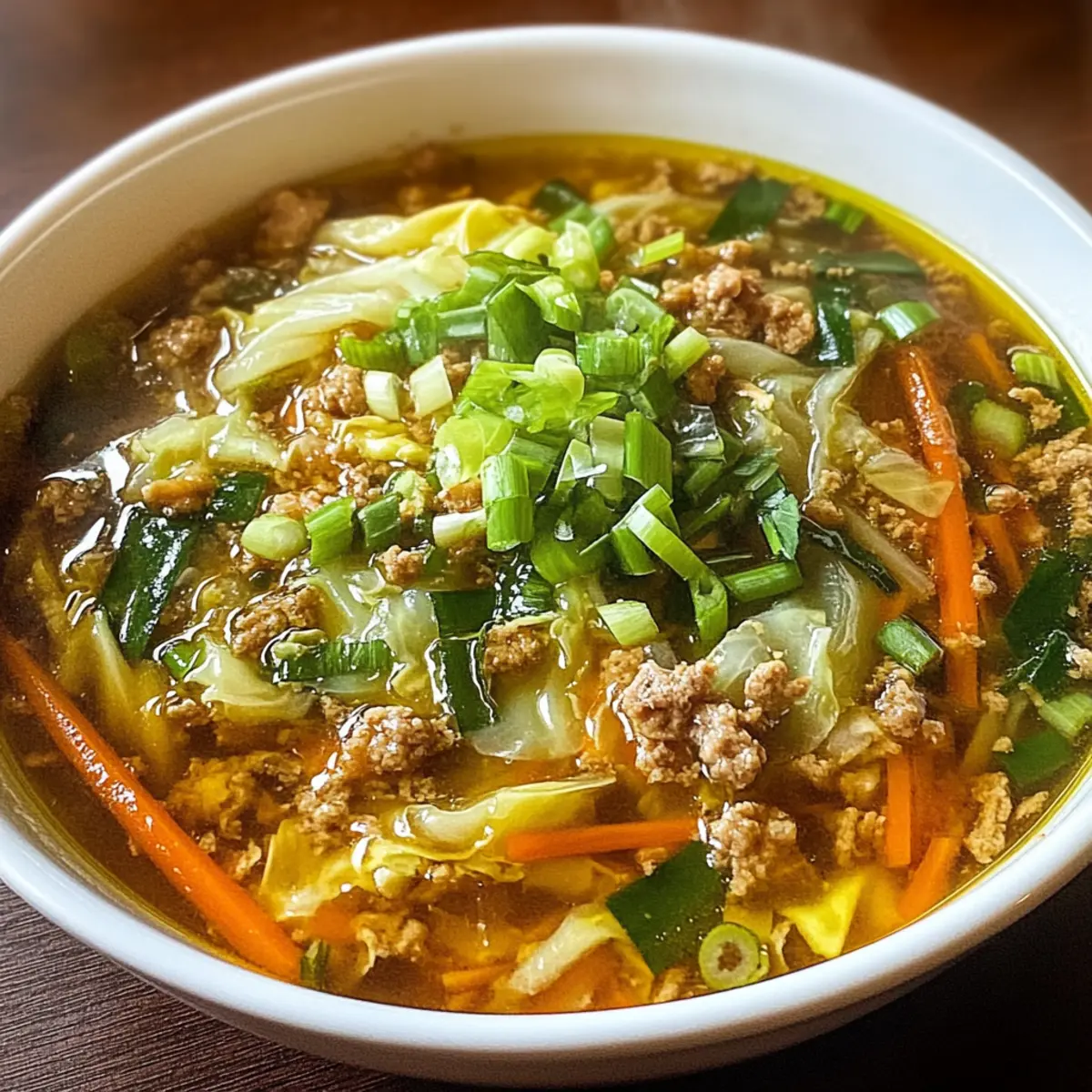 Stir in 4 cups of thinly sliced napa cabbage and 2 julienned carrots. Cook for 5–7 minutes, stirring occasionally, until the vegetables are tender yet still retain a slight crunch. This adds both nutrition and a delightful texture to your Healthy Egg Roll Soup.