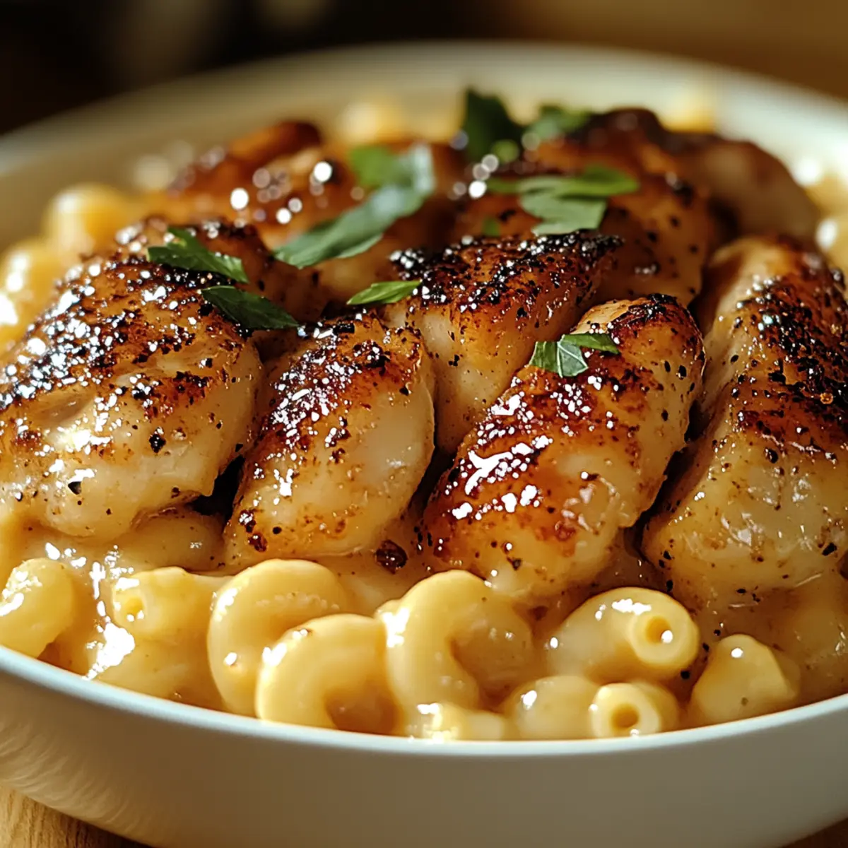 - To serve, spoon a generous portion of the macaroni onto each plate. Top with sliced honey-glazed chicken and garnish with parsley and a sprinkle of crushed red pepper flakes.