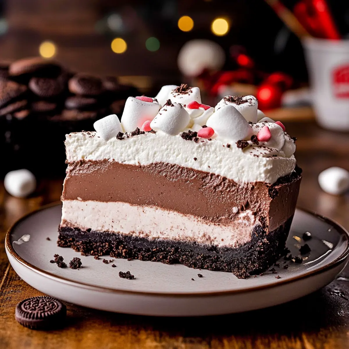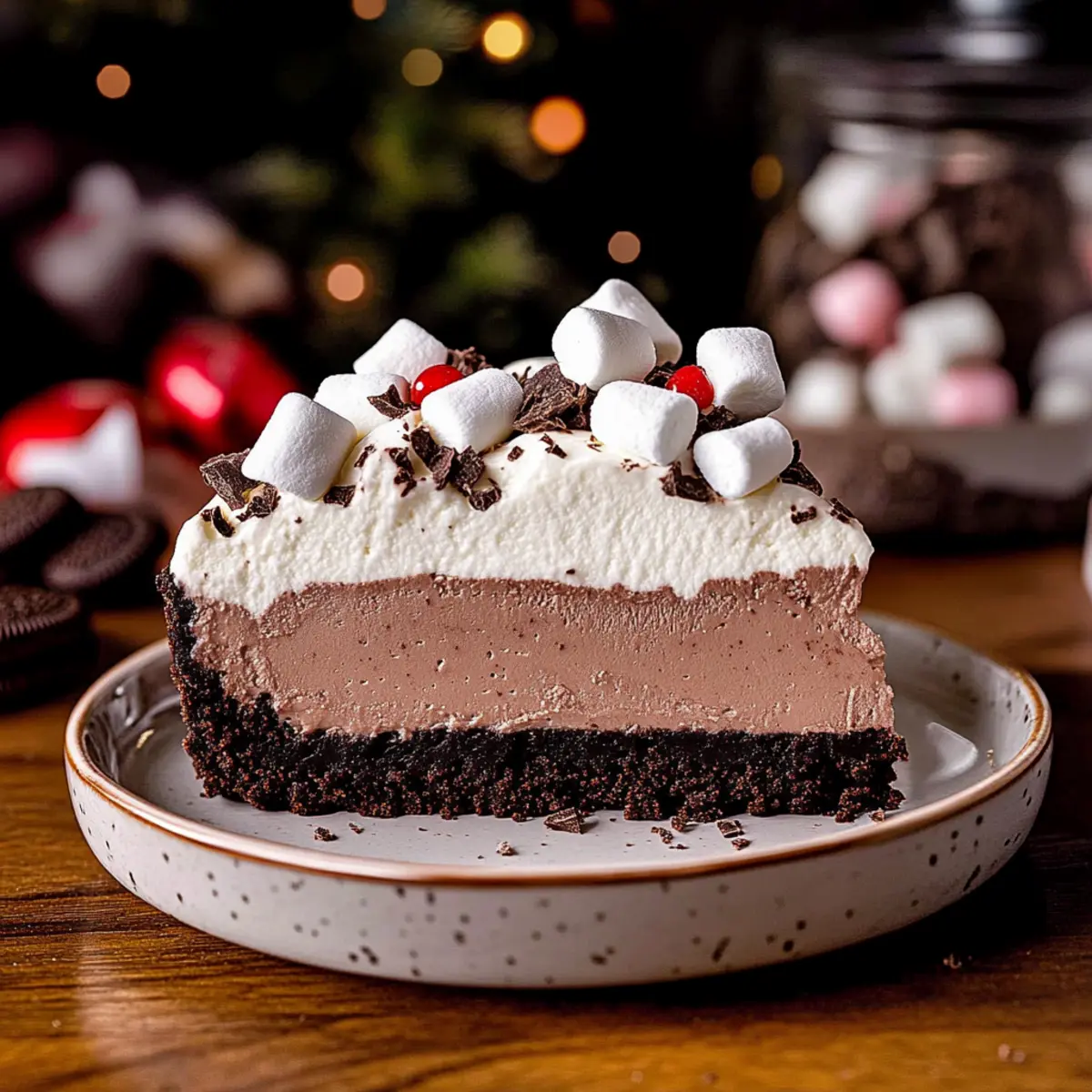Indulgent Layers: This hot chocolate cheesecake is a delightful combination of silky richness and a crunchy Oreo crust.