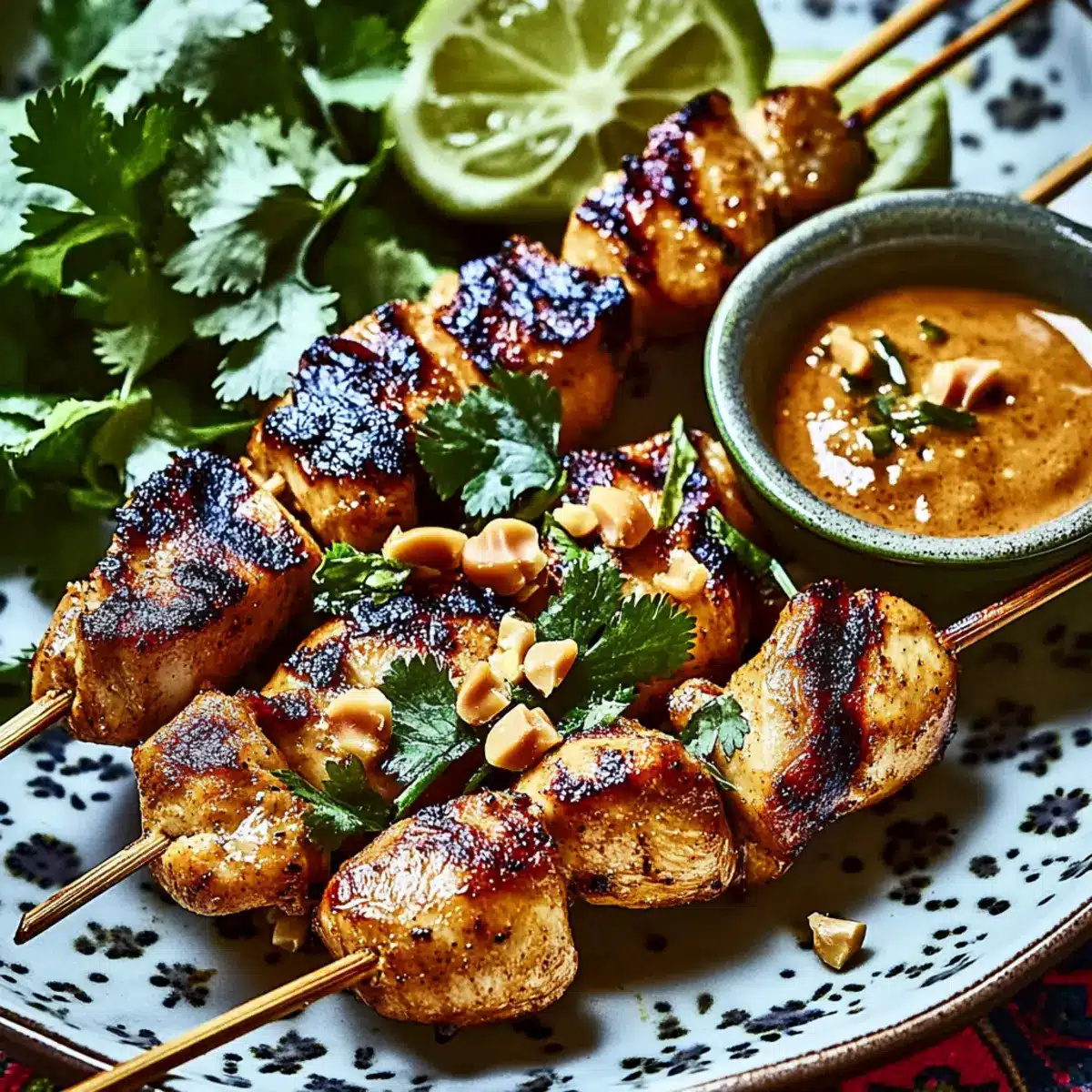 - Transfer grilled skewers to plates, drizzle with peanut sauce, and garnish with chopped peanuts and cilantro.