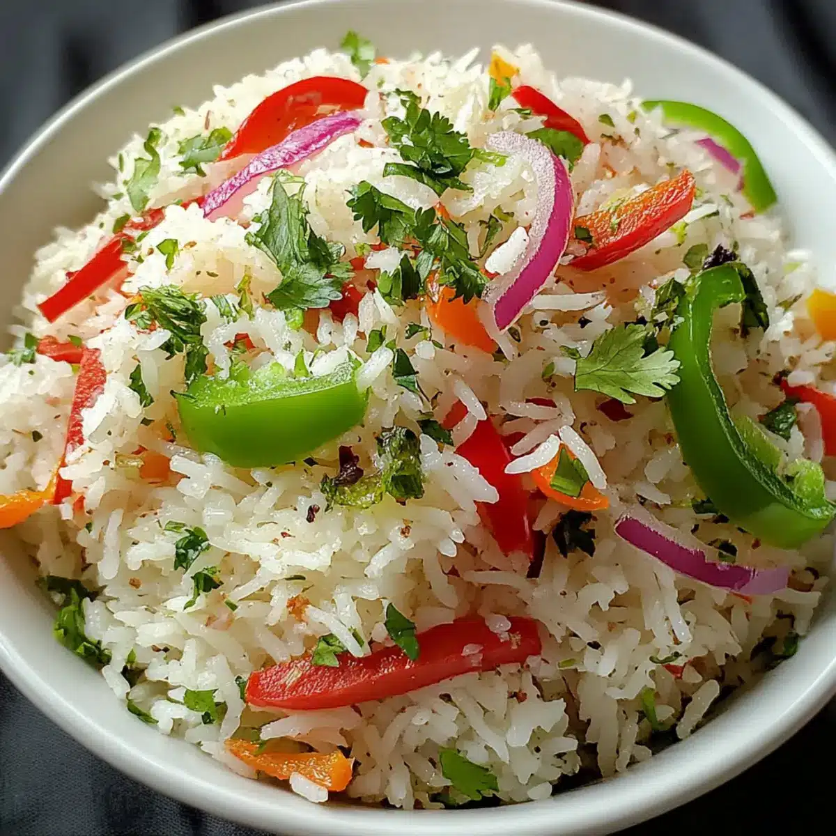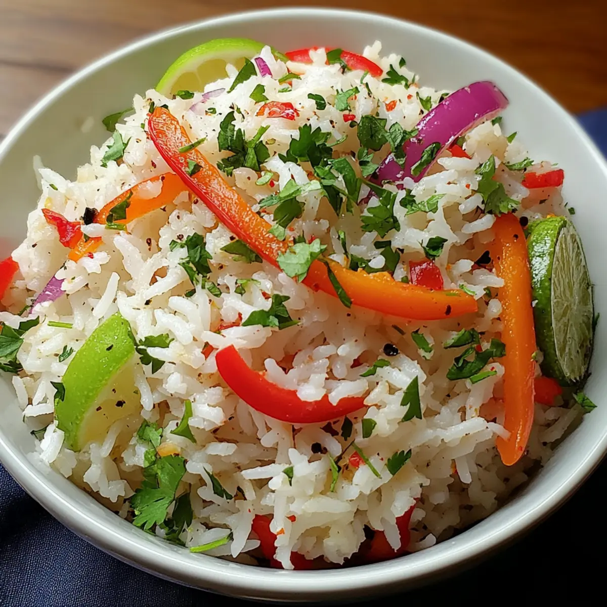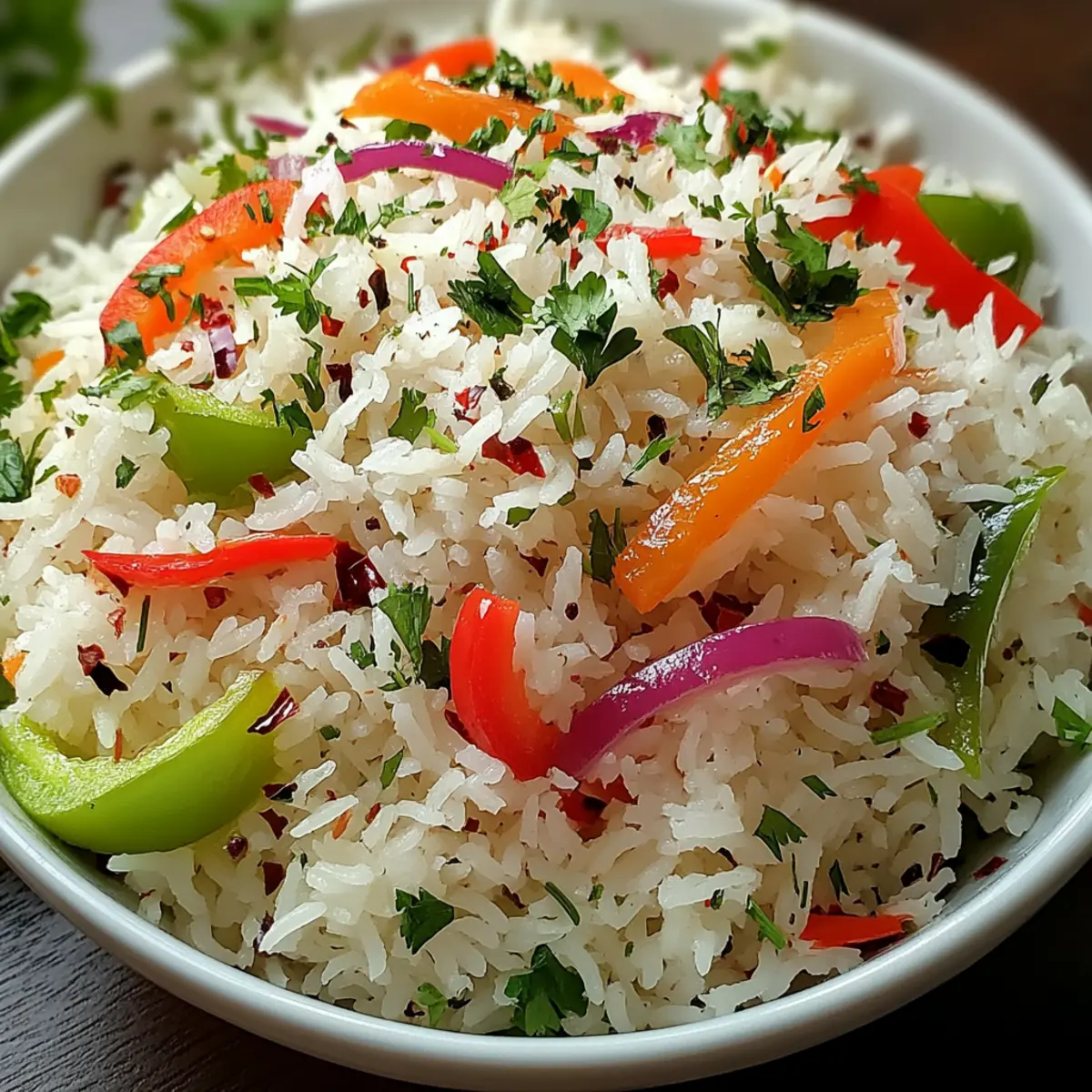 Serve your vibrant Island Coconut Pepper Rice warm, accompanied by lime wedges. The zesty acidity from the lime will perfectly balance the richness of the coconut, elevating each delightful bite and bringing a slice of tropical paradise to your table.