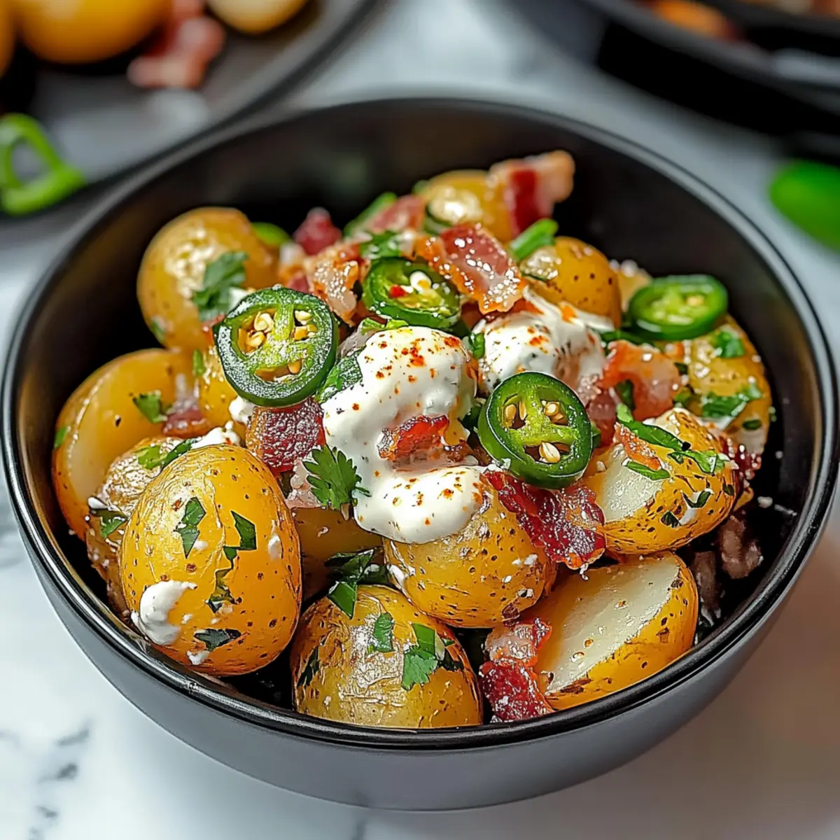 - Combine cooled potatoes, creamy dressing, crumbled bacon, diced jalapeños, green onions, and cilantro.