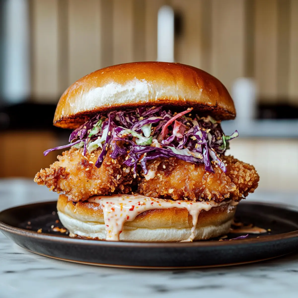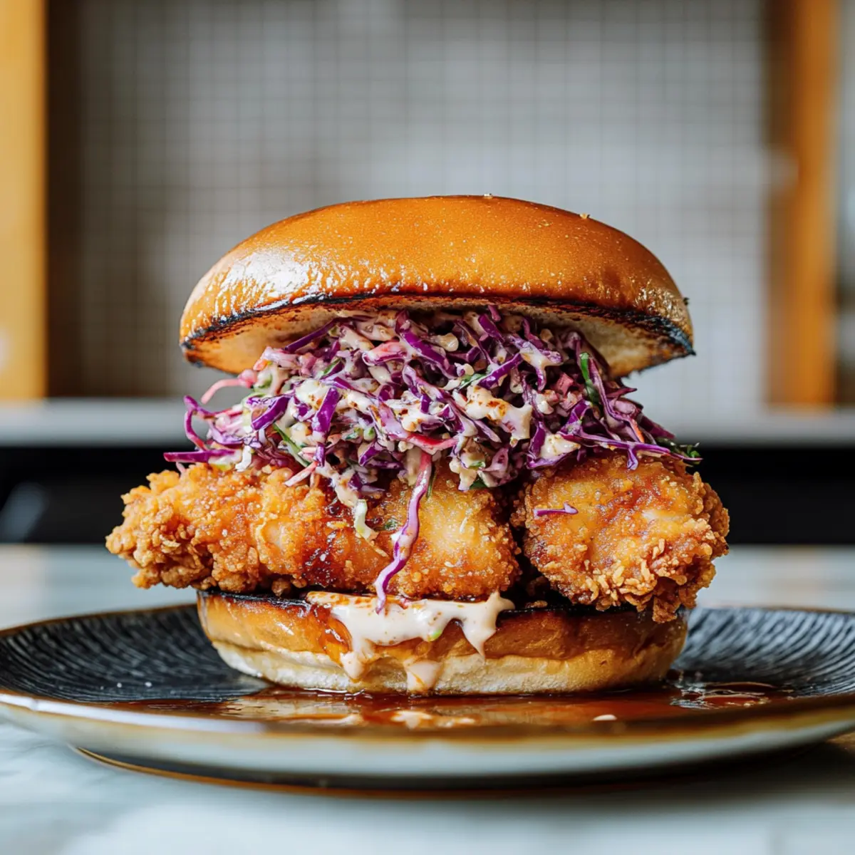 - Assemble the Sandwich: Layer fried chicken, ponzu slaw, and lemon juice on the bun.
