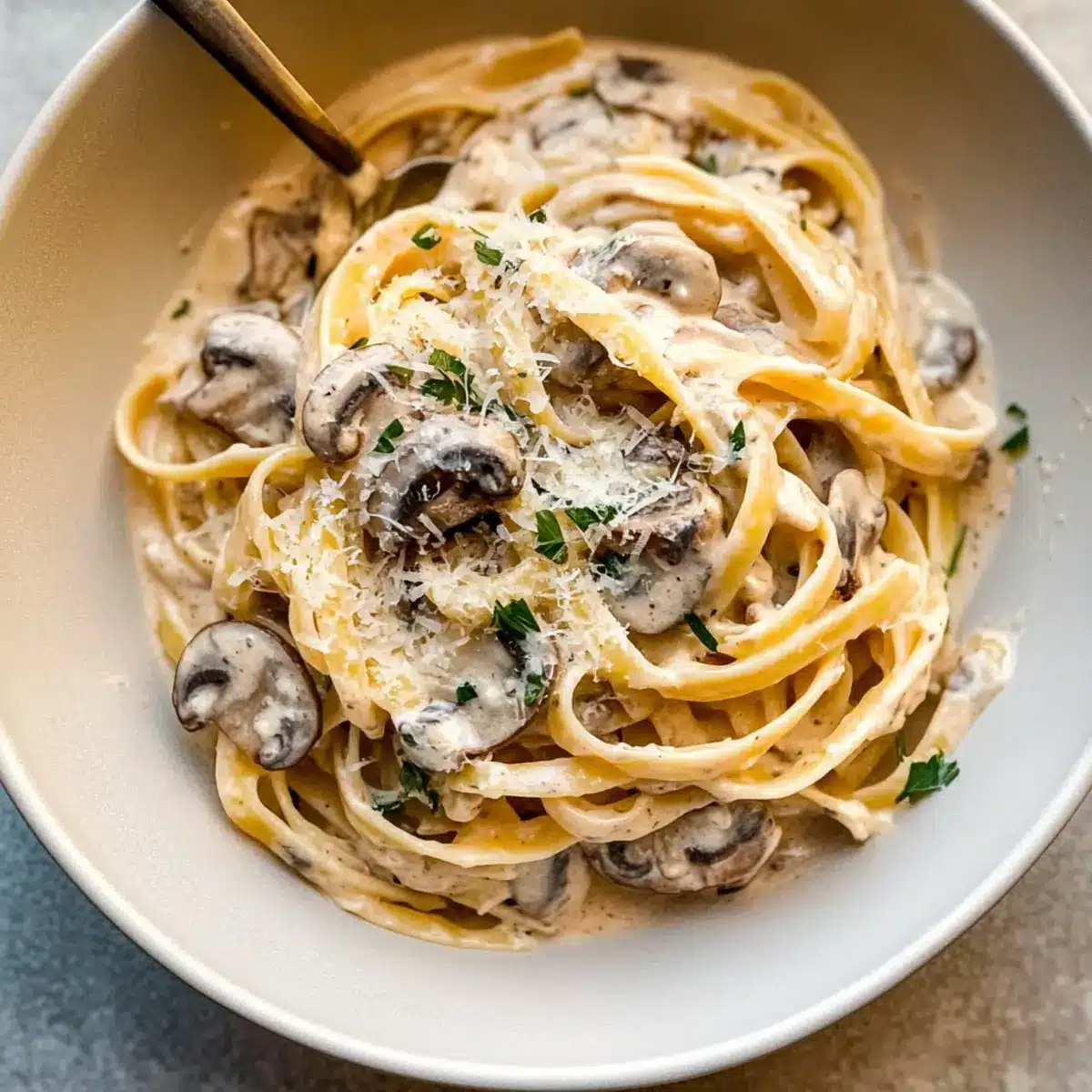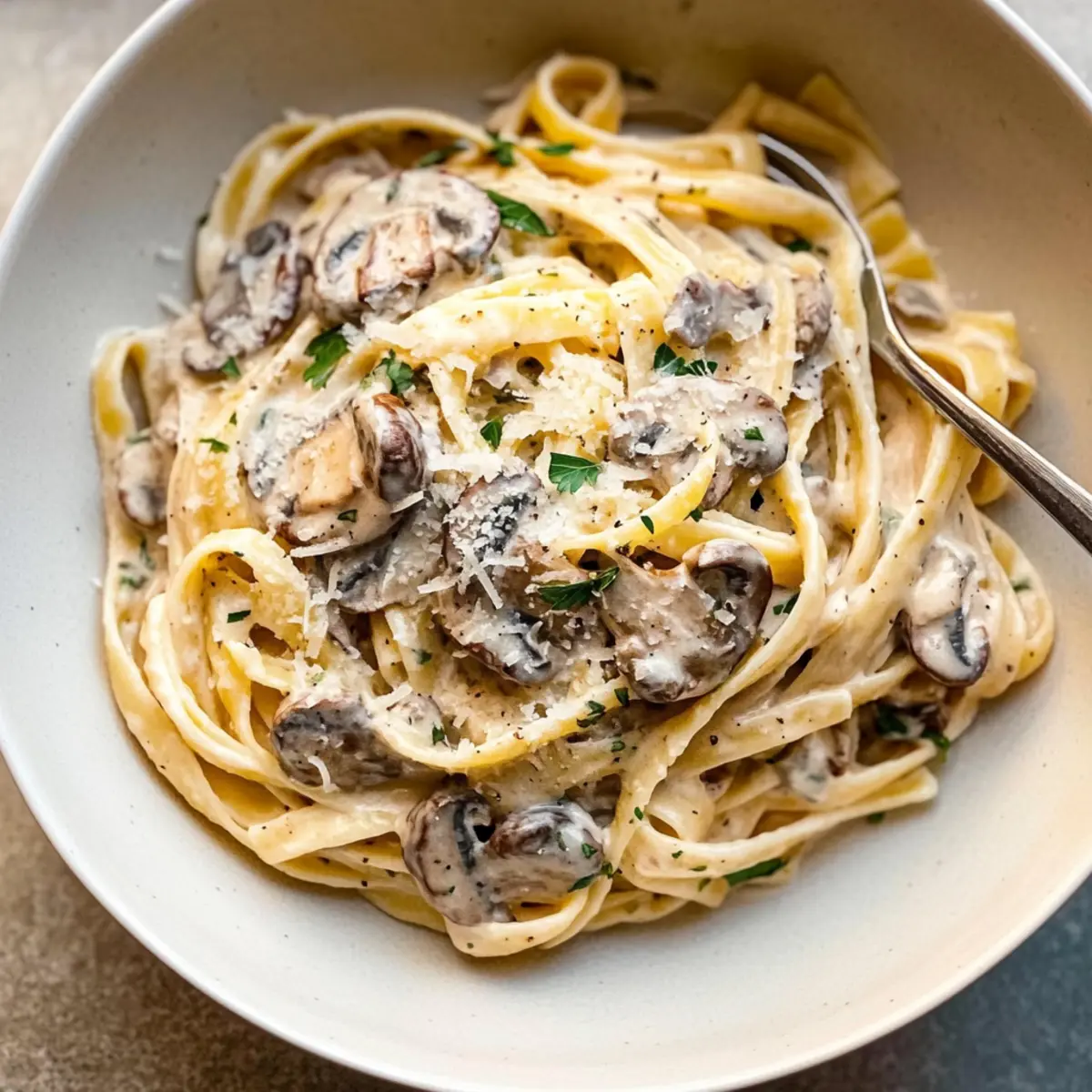 Cook 12 ounces of fettuccine according to package instructions until al dente, then drain. Add the cooked pasta directly to the skillet with the creamy mushroom sauce, tossing well to coat the noodles evenly. If desired, finish with ¼ cup of grated Parmesan cheese and a sprinkle of fresh parsley for added flavor and a pop of color.