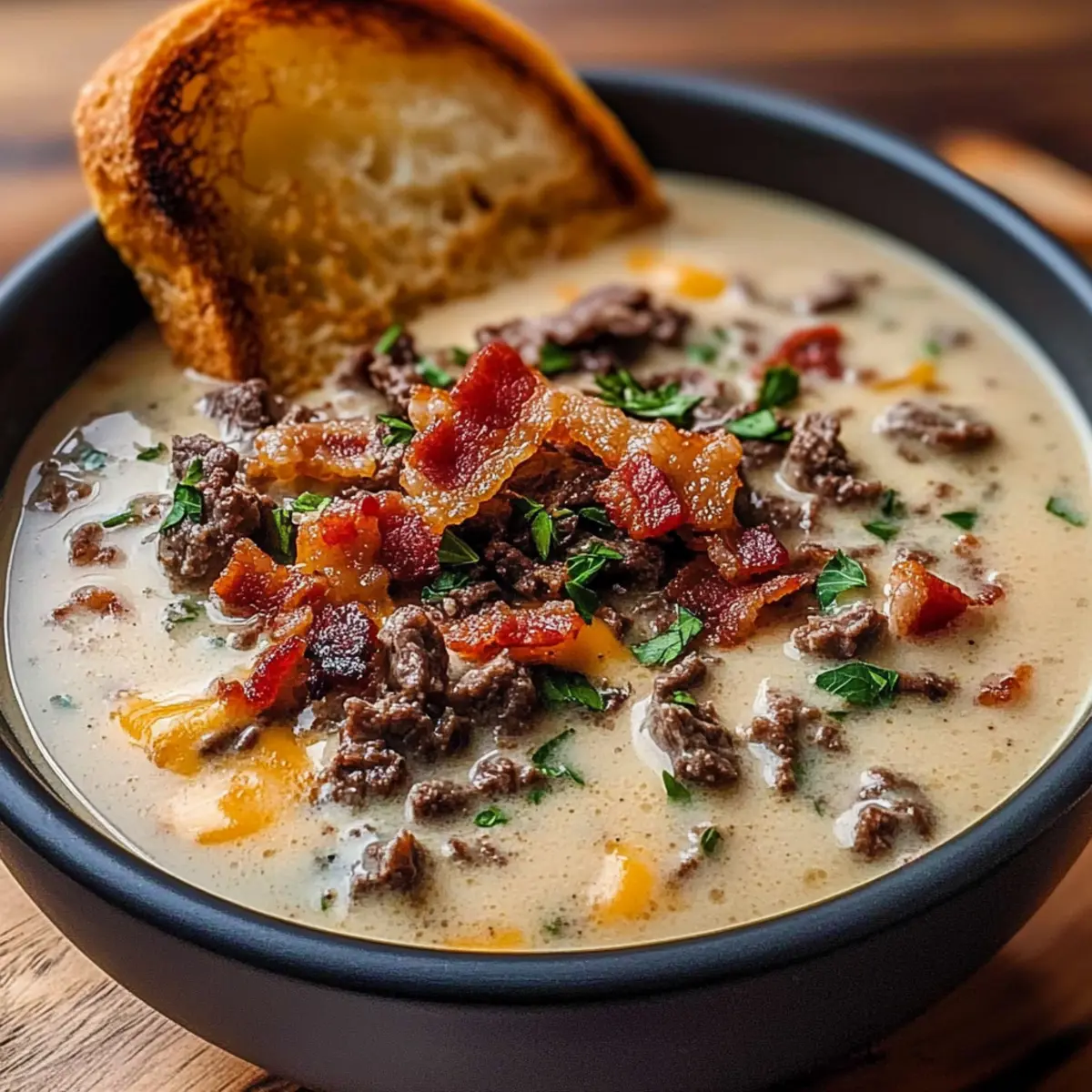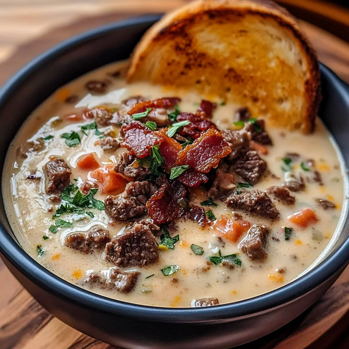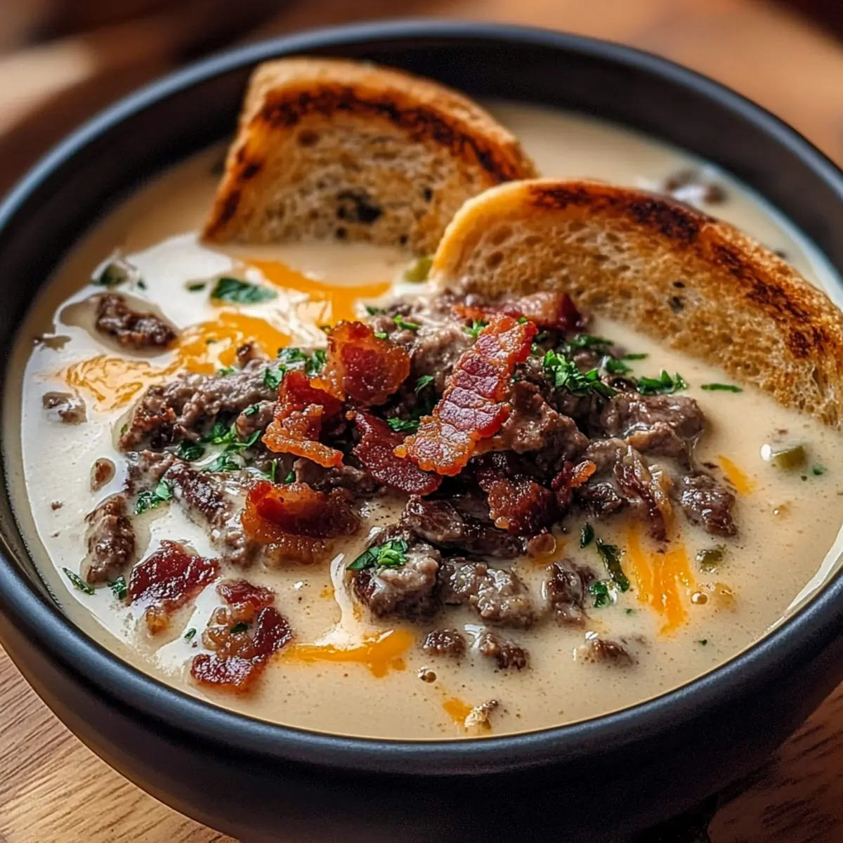 One-Pot Philly Cheesesteak Soup with Bacon and Cheesy Toast Delight