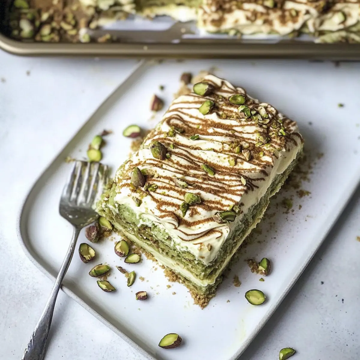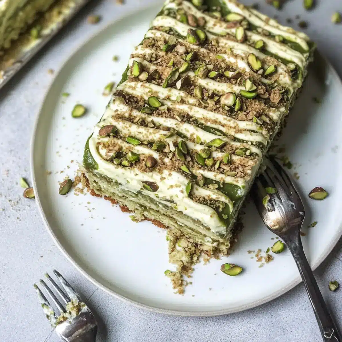 For a beautiful finish, use the extra pistachio cream to pipe decorative swirls on top of the final cream layer. Utilize a piping bag fitted with a small tip for precision. You can also use a toothpick to create a feathered effect by gently drawing through the piping for an artistic touch.