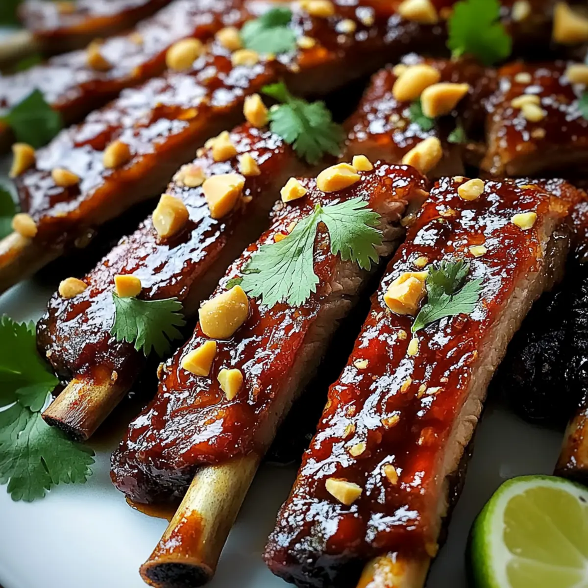 - Remove the ribs from the oven and sprinkle with the chopped peanuts and fresh cilantro. Serve the remaining BBQ sauce on the side for dipping.