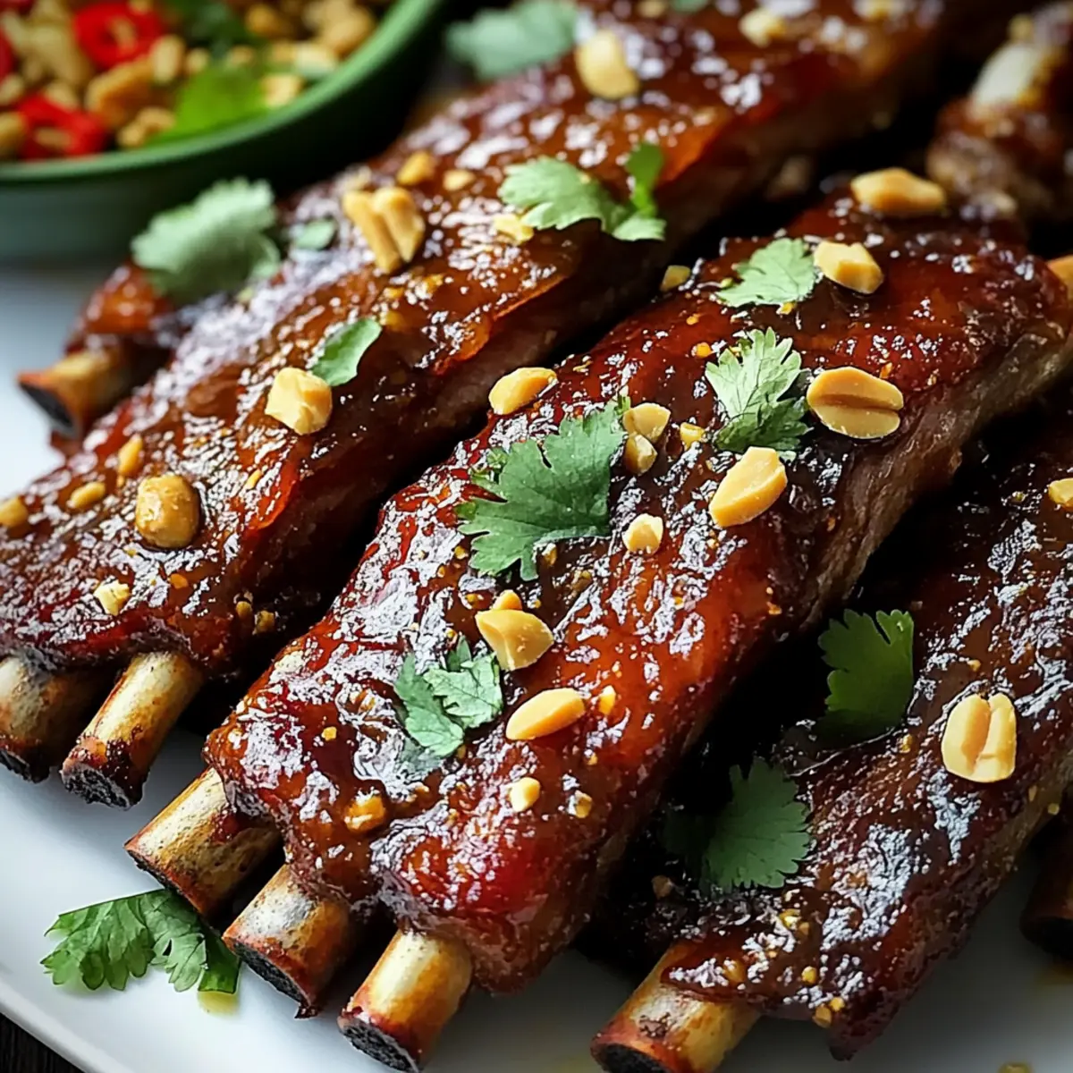 Remove the ribs from the oven and sprinkle with the chopped peanuts and fresh cilantro to add texture and color. Serve the remaining BBQ sauce on the side for dipping. These Thai Style Sweet Chili Ribs are now ready to delight your family and friends with their unique flavors and tender, juicy goodness.
