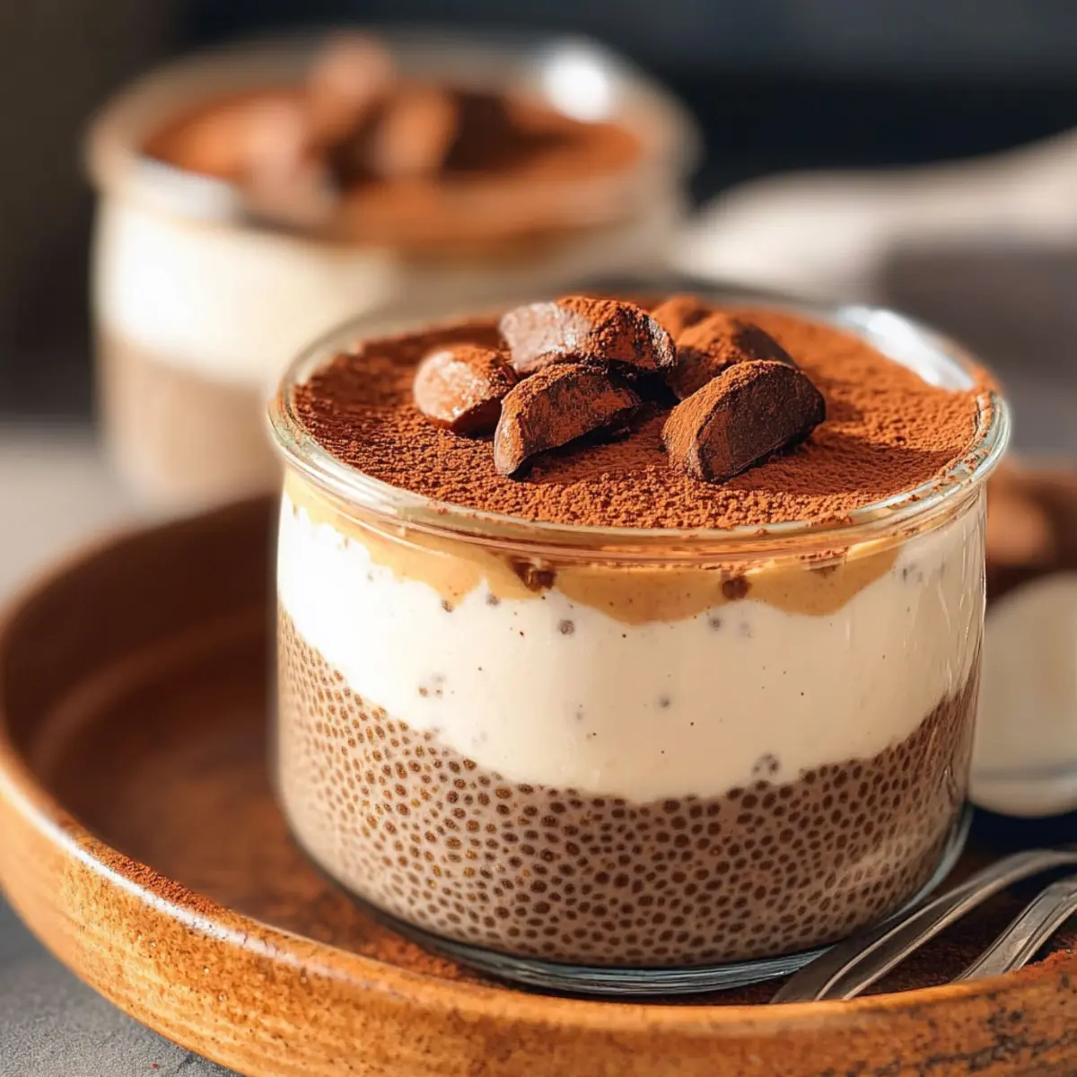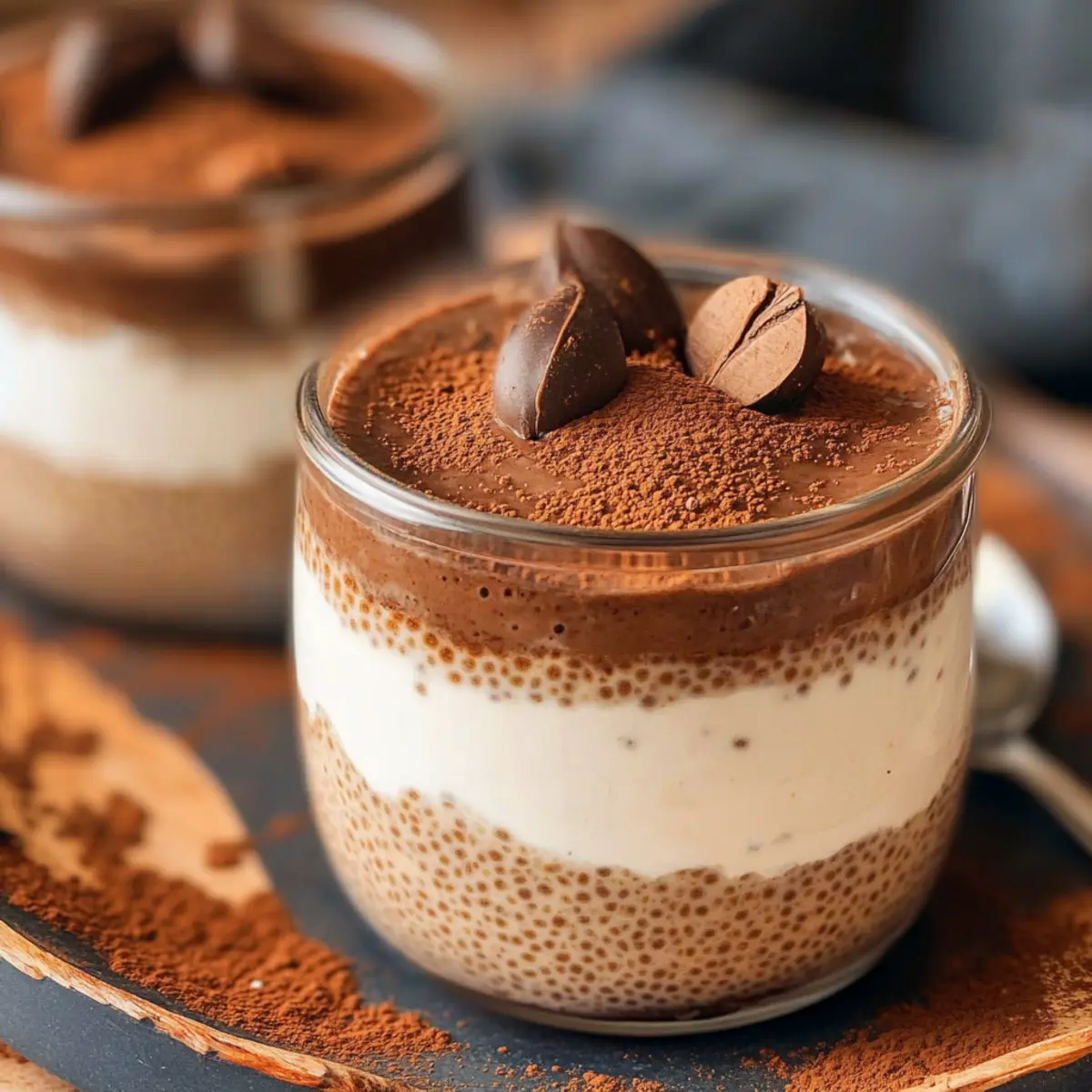 These Tiramisu Chia Pudding jars are a stellar choice for meal prep, allowing you to enjoy deliciousness throughout the week! You can easily prepare the pudding base (Greek yogurt, chia seeds, and all the delightful flavors) up to 24 hours in advance. Simply blend your ingredients and portion them into jars. For the best quality, refrigerate them immediately after assembly, ensuring they stay fresh and creamy. When it’s time to serve, whip up your topping and layer it over the chilled pudding. A quick dusting of cocoa powder gives it that classic tiramisu elegance, making your treat just as delightful as when freshly made!