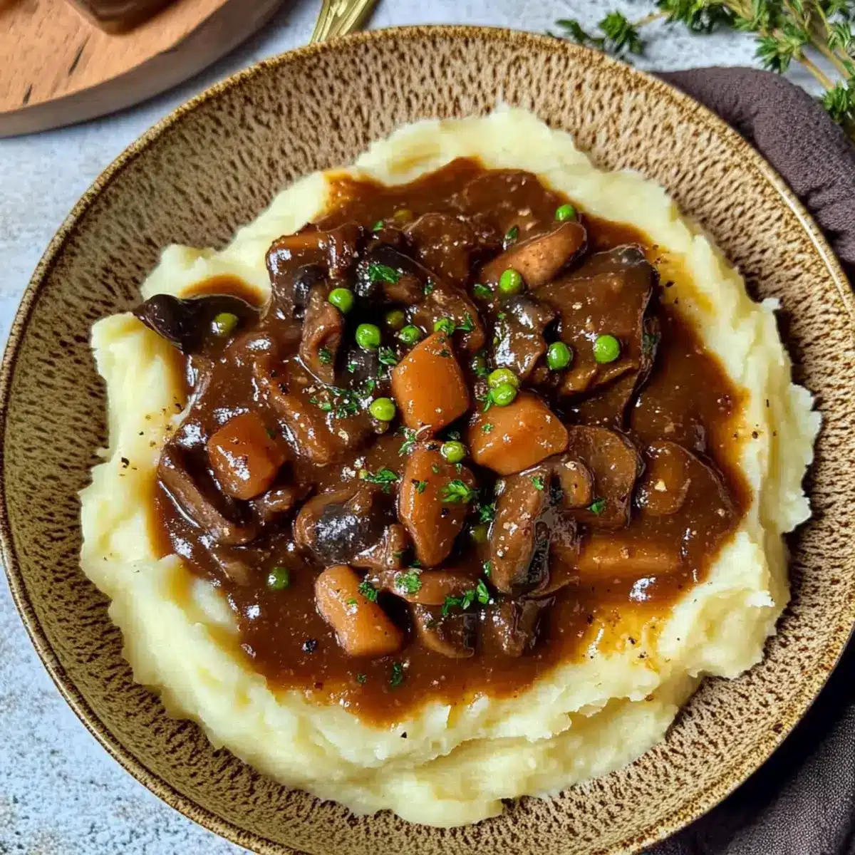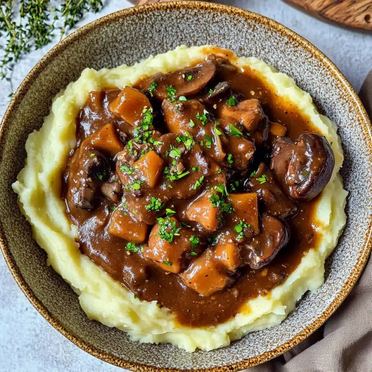 - Serve the Vegan Mushroom Bourguignon over creamy mashed potatoes, garnish with fresh thyme and enjoy.