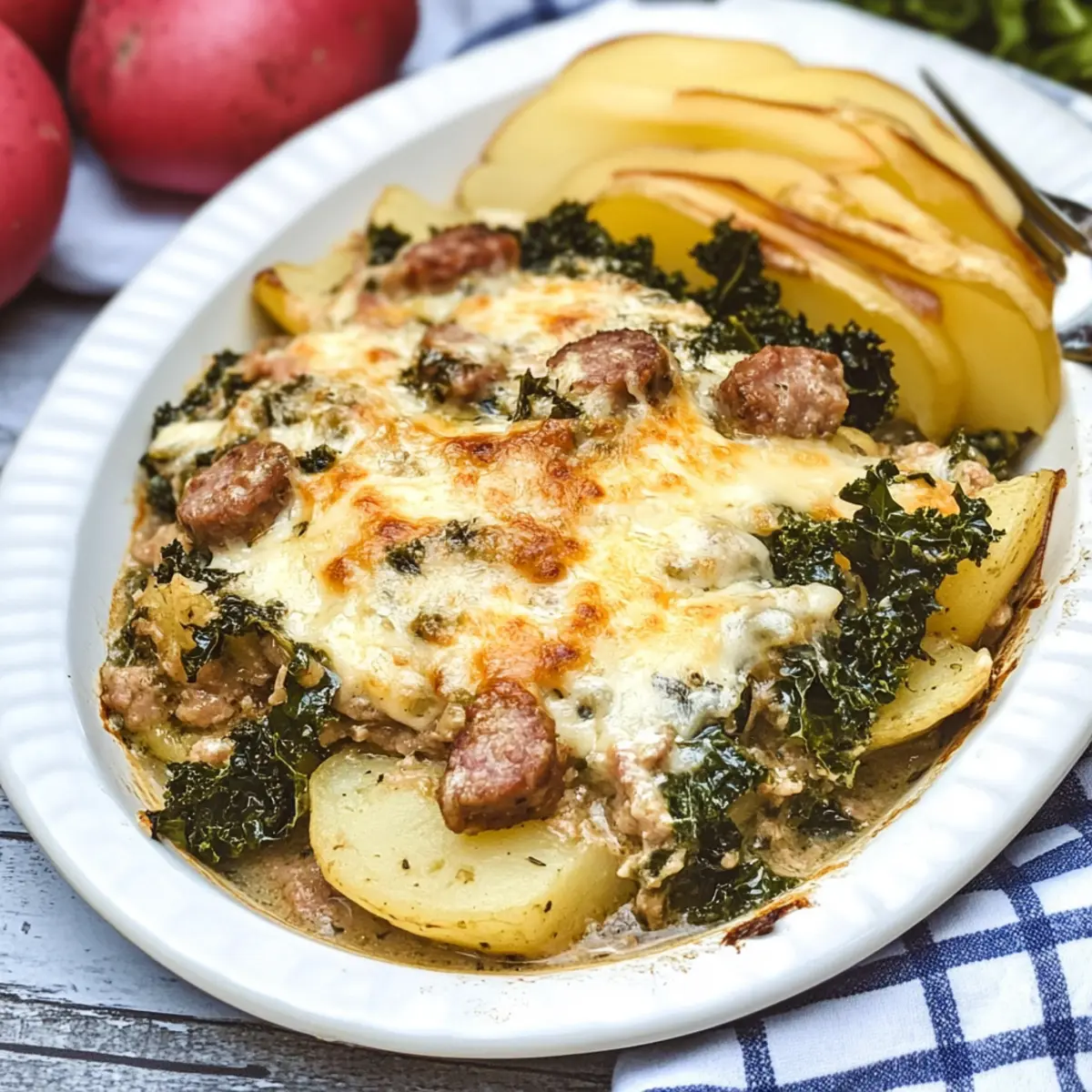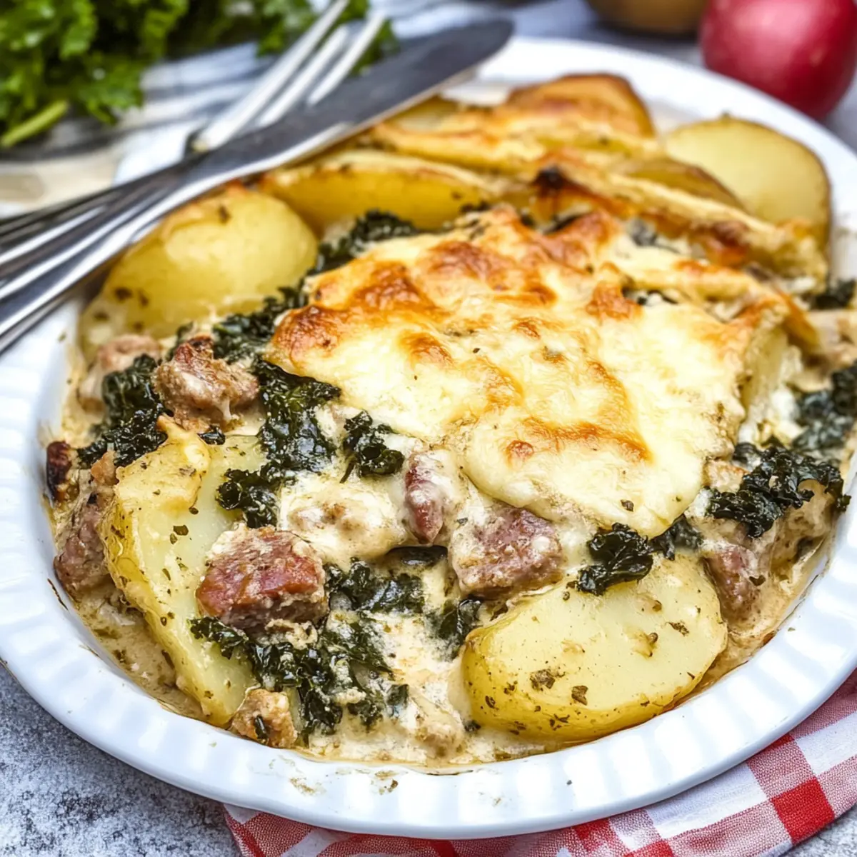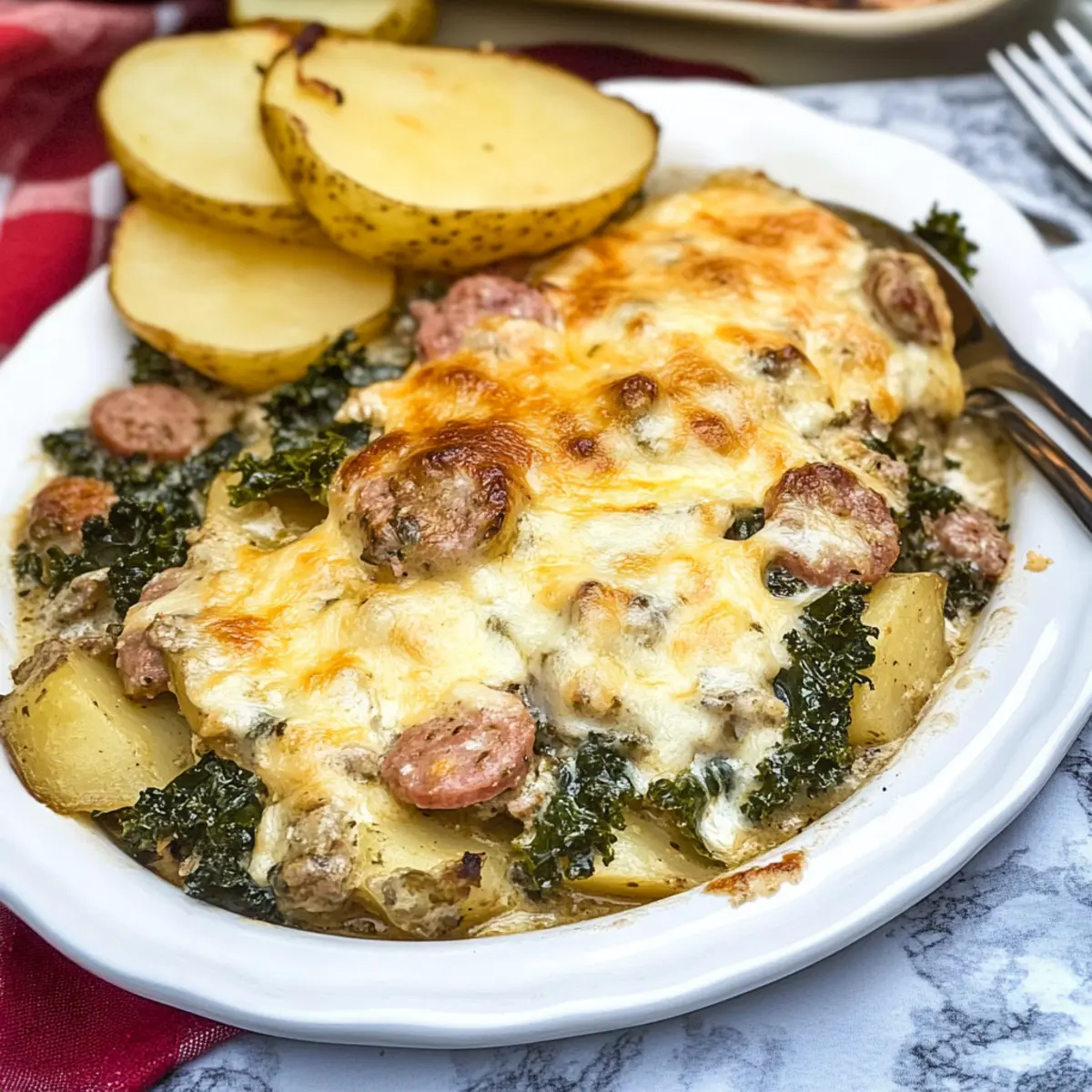 These Zuppa Toscana Casserole components are perfect for meal prep, saving you precious time on busy weeknights! You can slice the potatoes and layer them in the baking dish up to 24 hours in advance. Additionally, you can cook the sausage, bacon, and sauté the onion and garlic, then refrigerate these ingredients for up to 3 days. When you’re ready to finish the casserole, simply combine the prepared ingredients, add the creamy sauce, and bake as directed. To maintain quality, keep the layers covered and chill them promptly to avoid browning. With this make-ahead approach, you’ll have a satisfying dinner ready in no time, just waiting to warm your family’s hearts!